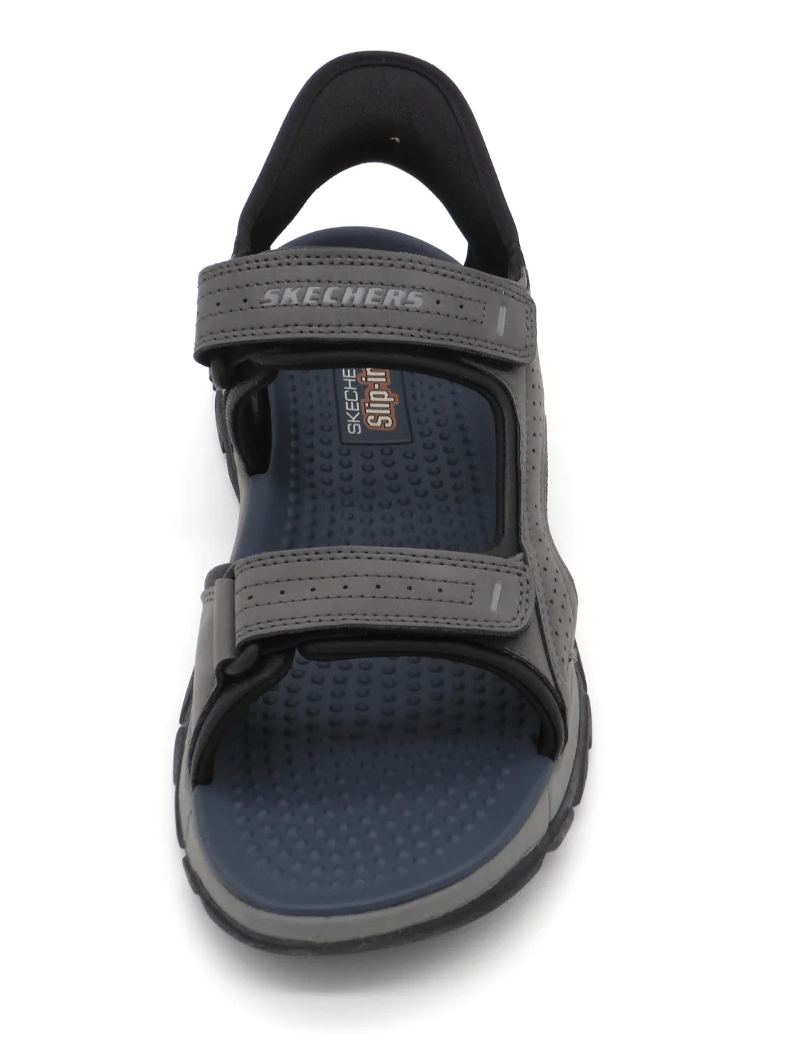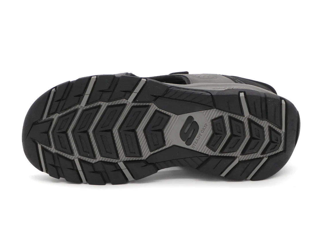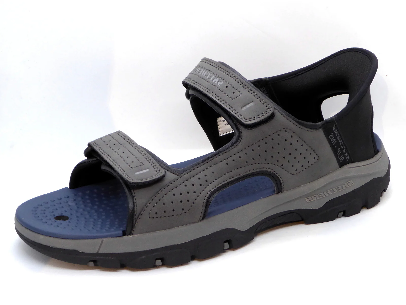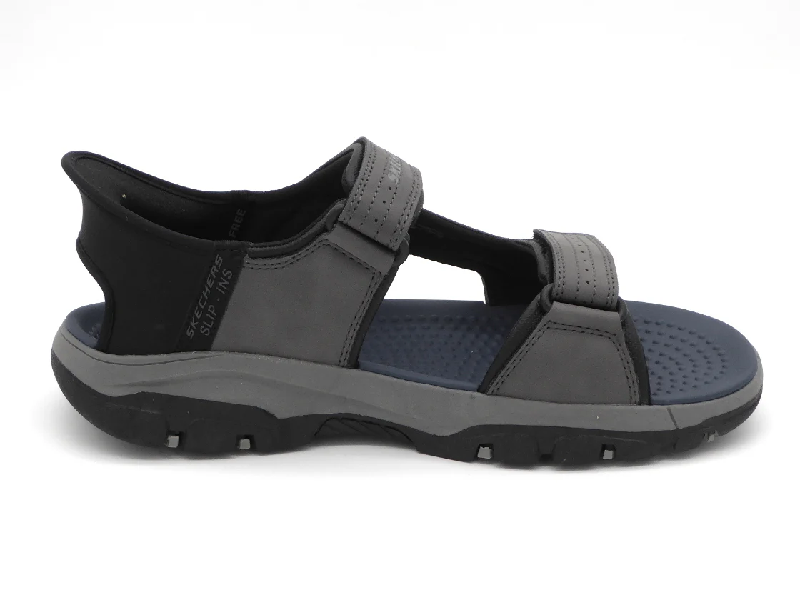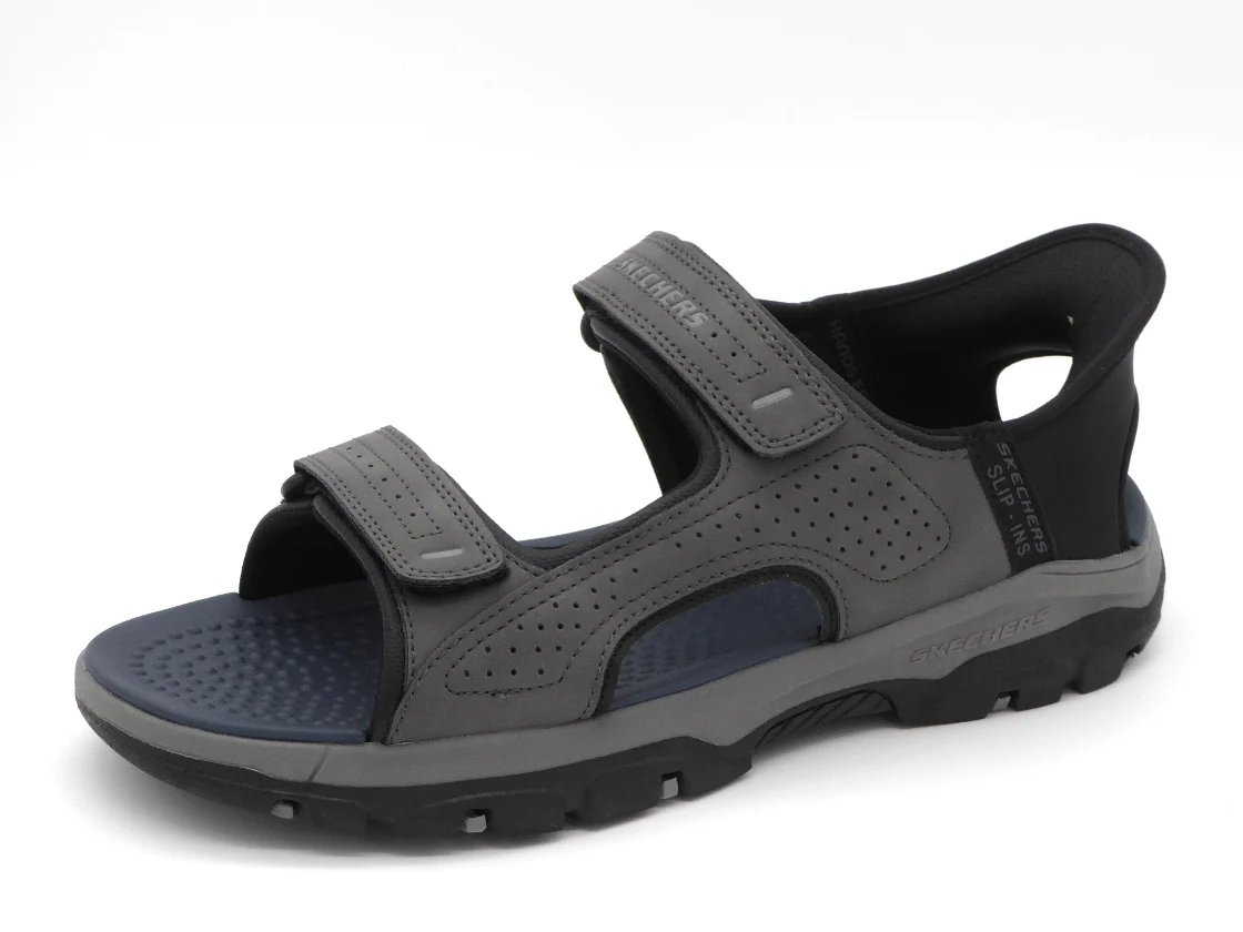 Heren sandaal Skechers Hands Free Slip-Ins®: Relaxed Fit™: Tresmen – Reece heeft een bovenwerk van duurzaam synthetisch materiaal met 2 klittenbanden op de wreef en een Skechers Hands Free Slip-ins® hielband met Heel Pillow™ dat de voet stevig op zijn plaats houdt. Het Relaxed Fit™ ontwerp zorgt voor een ruime, comfortabele pasvorm bij de neus en voorvoet. Dankzij het dempende voetbed met Air-Cooled Memory Foam loopt de sandaal extra comfortabel. De flexibele buitenzool met grip heeft een hakhoogte van 1,9 cm.