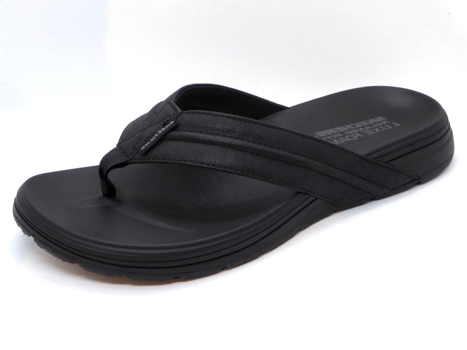 Heren teenslipper Skechers Relaxed Fit®: Patino – Marlee heeft een soepel bovenwerk van soepel imitatieleer met stiksels. Dit Relaxed Fit®-model heeft een ruime en comfortabele pasvorm en een goed gedempte voorgevormde Luxe Foam®-voetbed. De flexibele buitenzool met grip heeft een hakhoogte van 1,9 cm. De teenslipper is gemaakt van 100% vegan materialen.