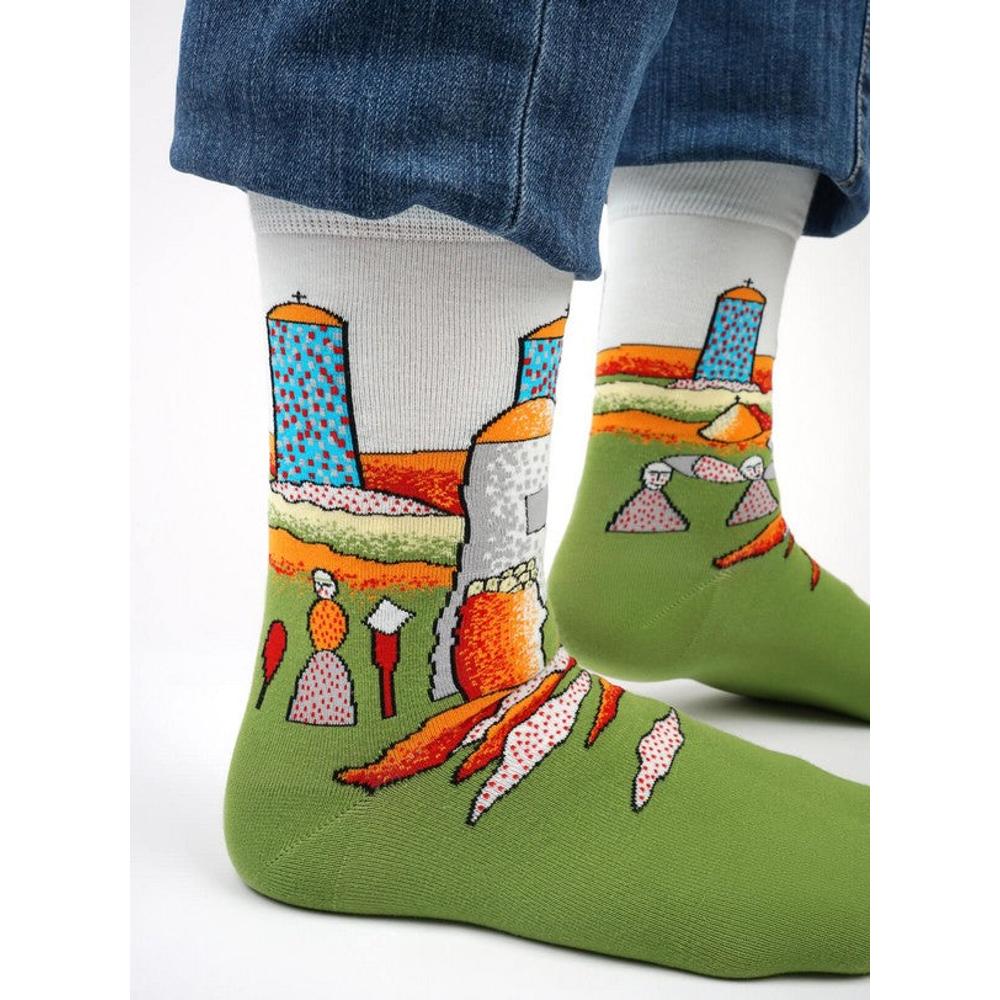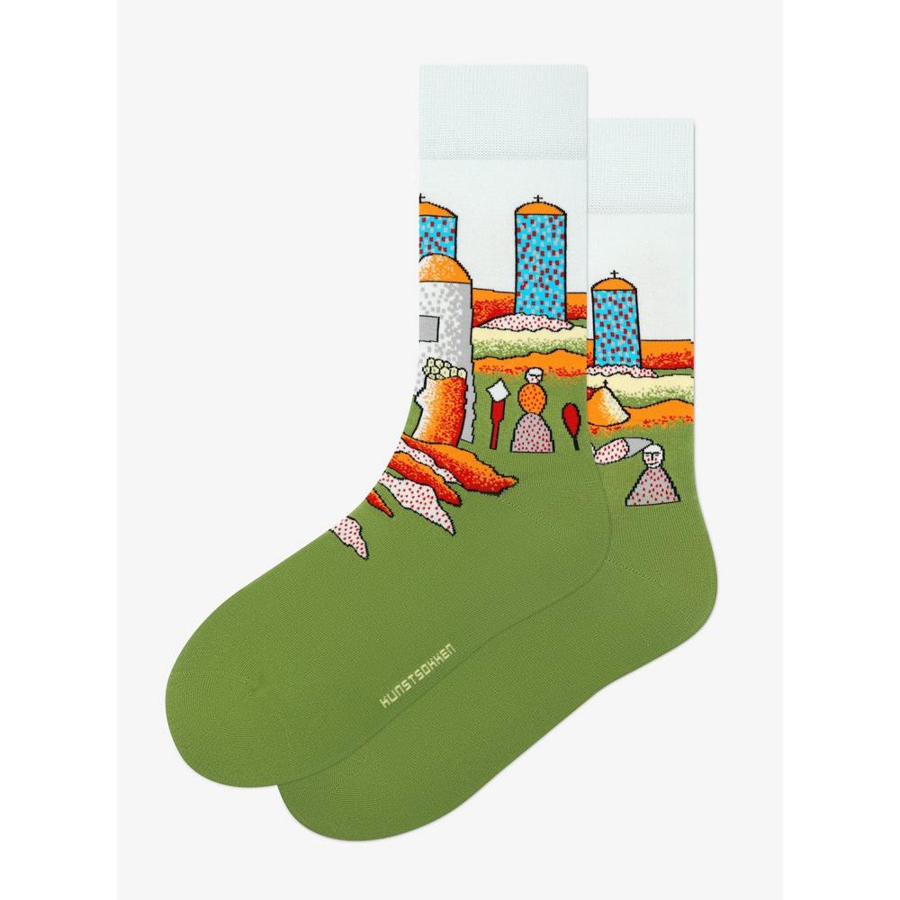 Een groot thema in zijn werken zijn de clowns die ook op deze sokken in het kleine dorpje zijn afgebeeld.