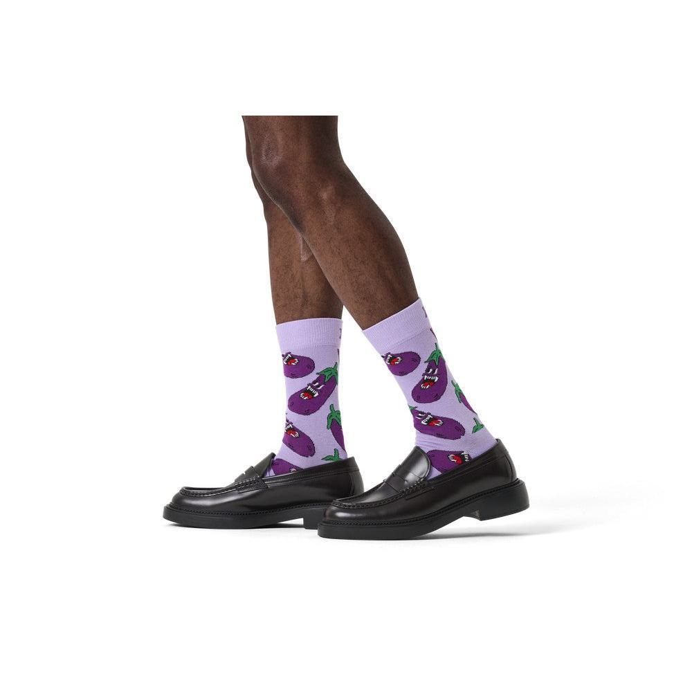 Deze opvallende sokken combineren een humoristische aubergineprint met de herkenbare, kleurrijke stijl van Happy Socks.