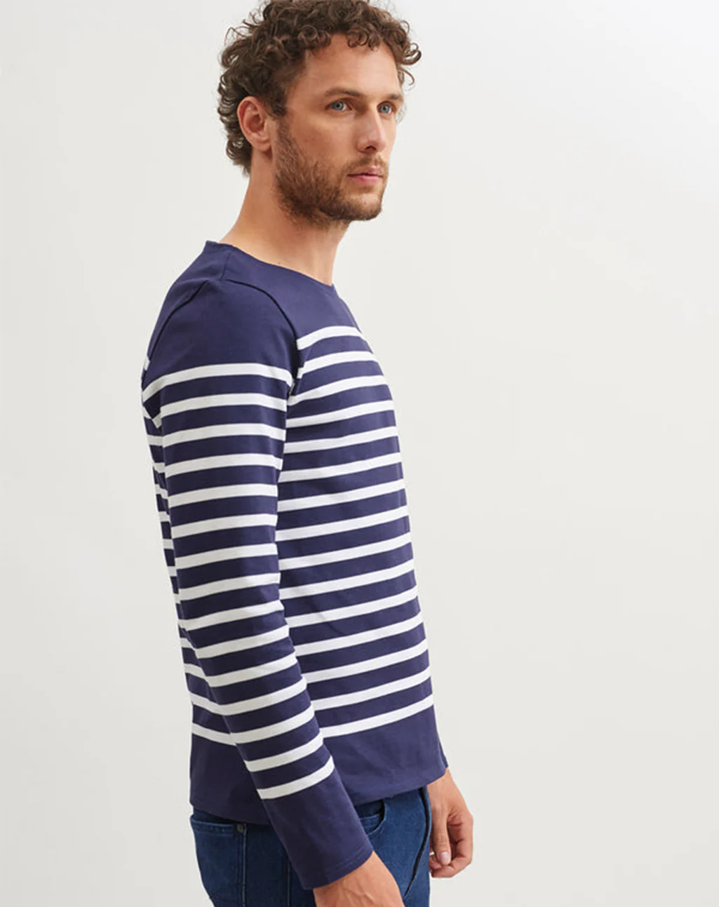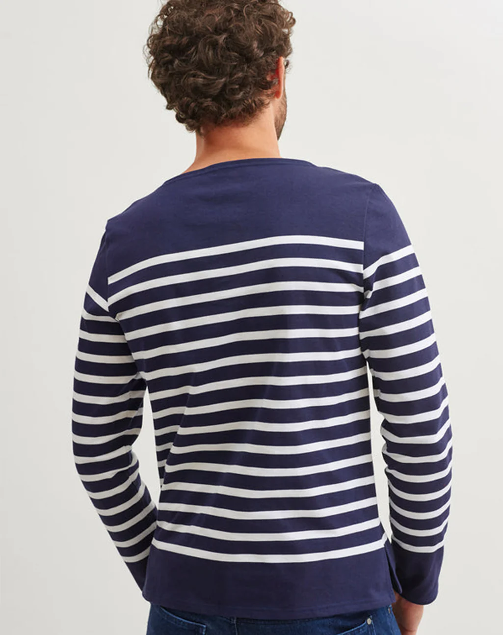 Gemaakt in Frankrijk van 100% gekamd katoen, biedt het shirt een comfortabele, middelzware kwaliteit die ideaal is voor elk seizoen. Het rechte model met boothals en splitjes aan de zijkant zorgt voor een klassieke maritieme uitstraling.