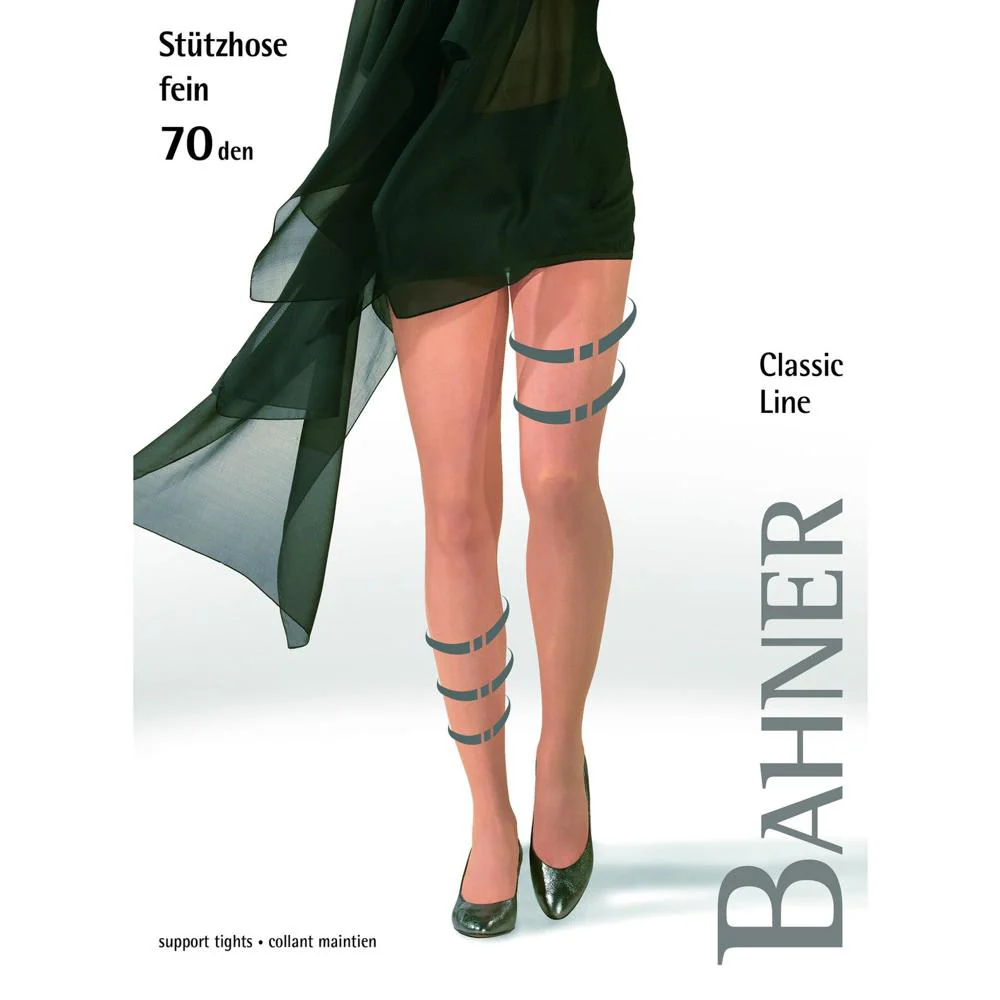 Deze opaque Classic 70 denier ondersteunende compressie panty van Bahner is geschikt voor mensen die veel staan, lange vluchten maken of een zittend beroep hebben.