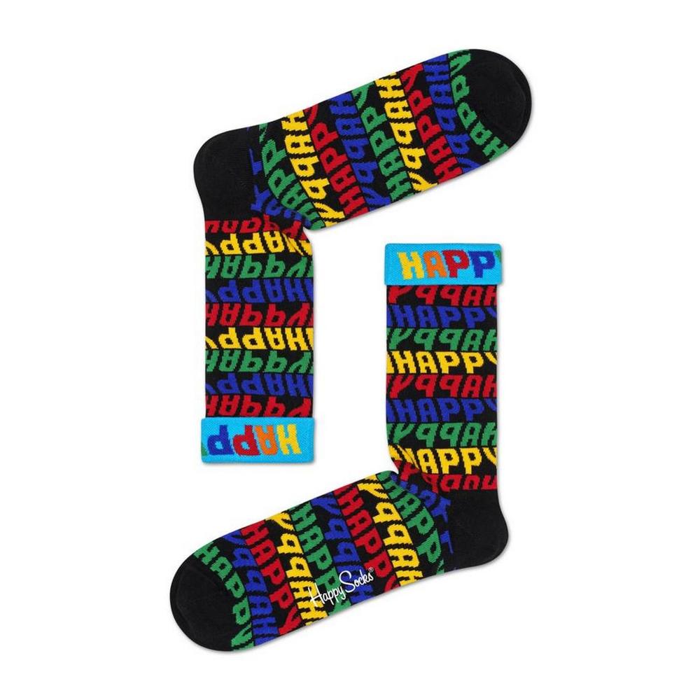 Veelkleurige print over de hele sokken met het woord HAPPY.