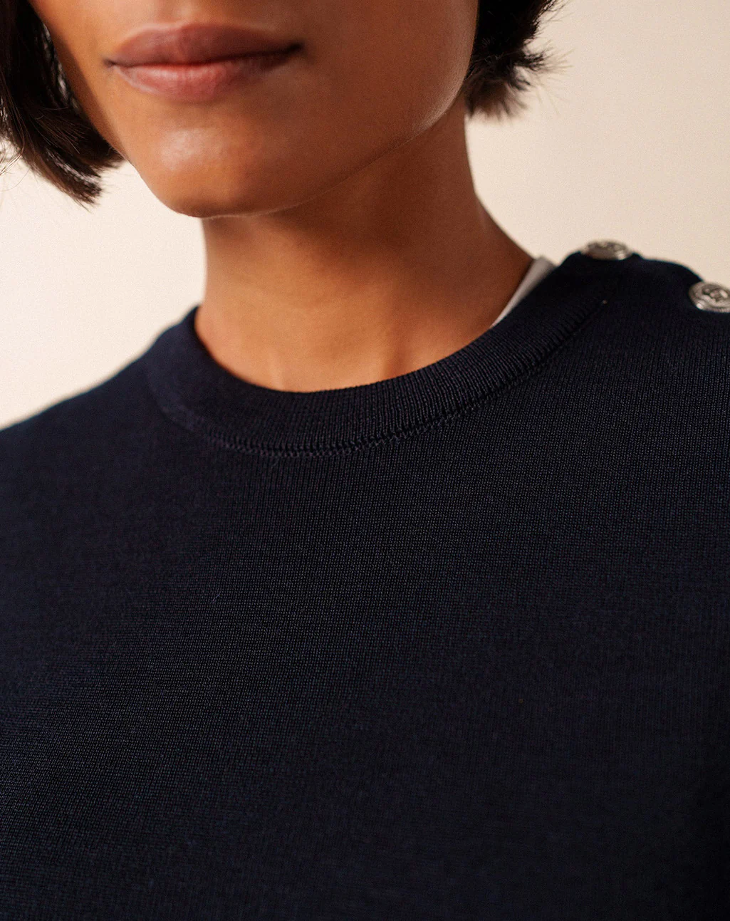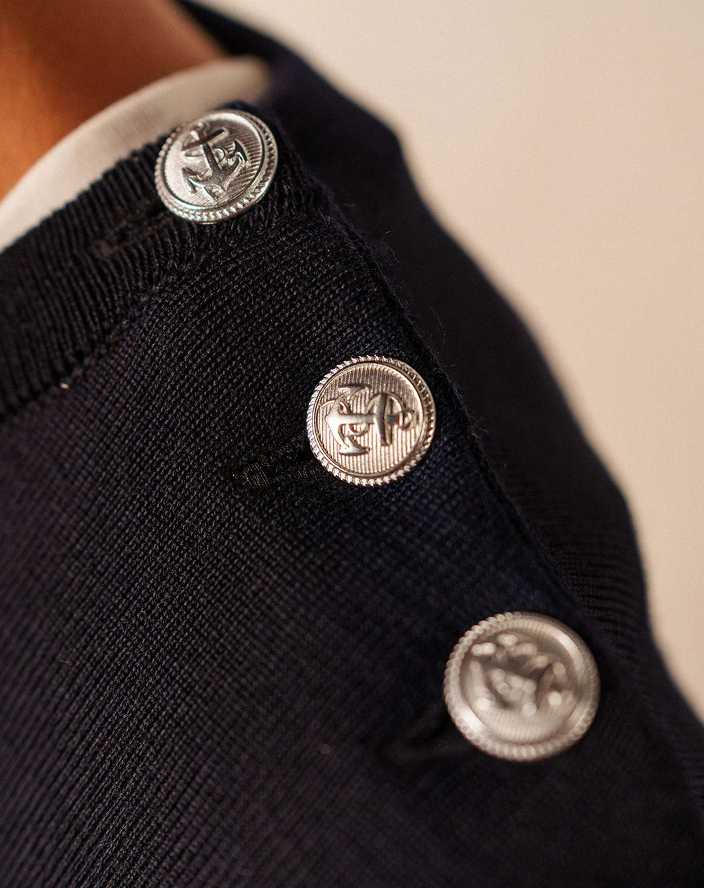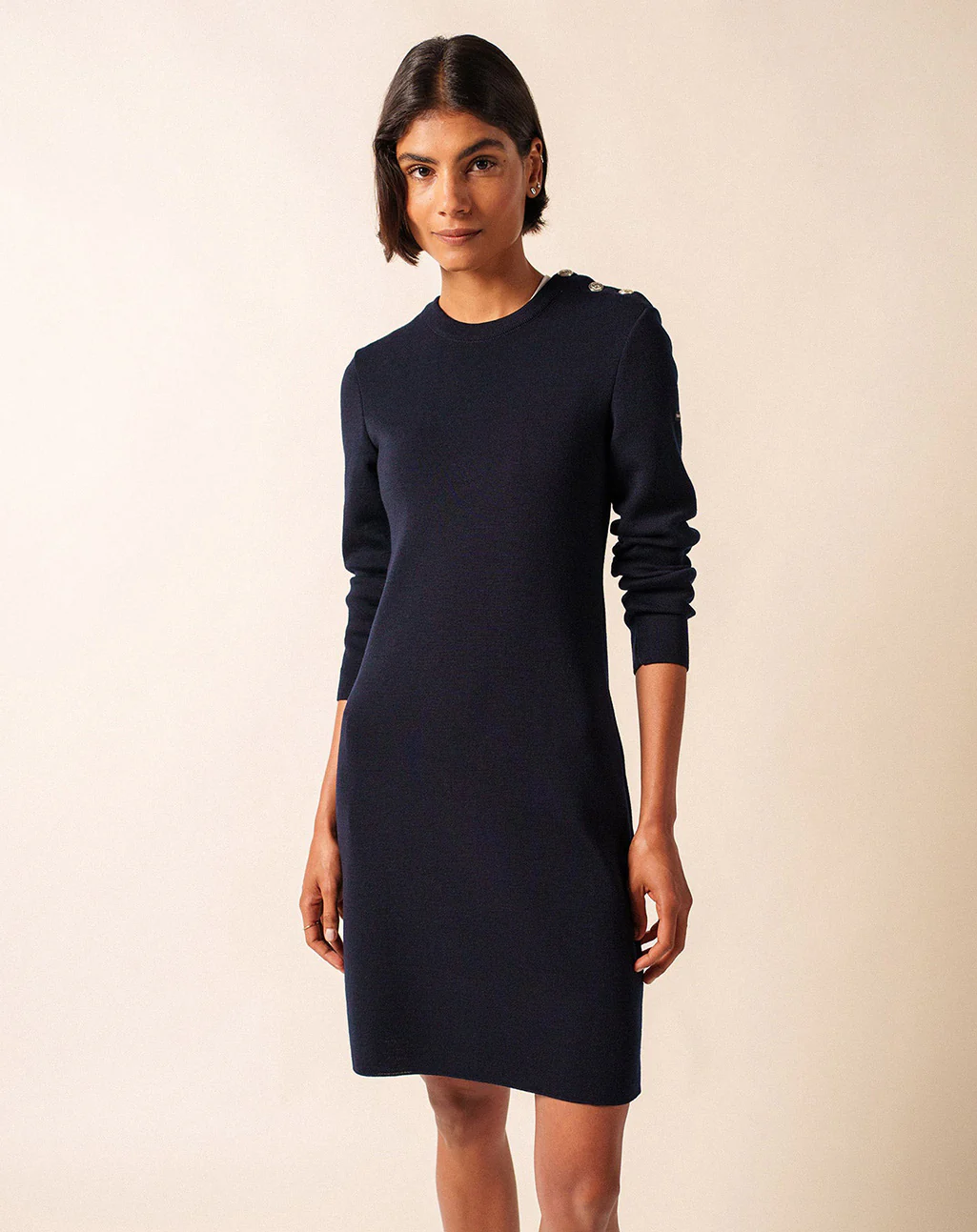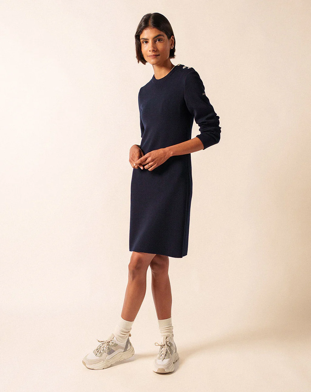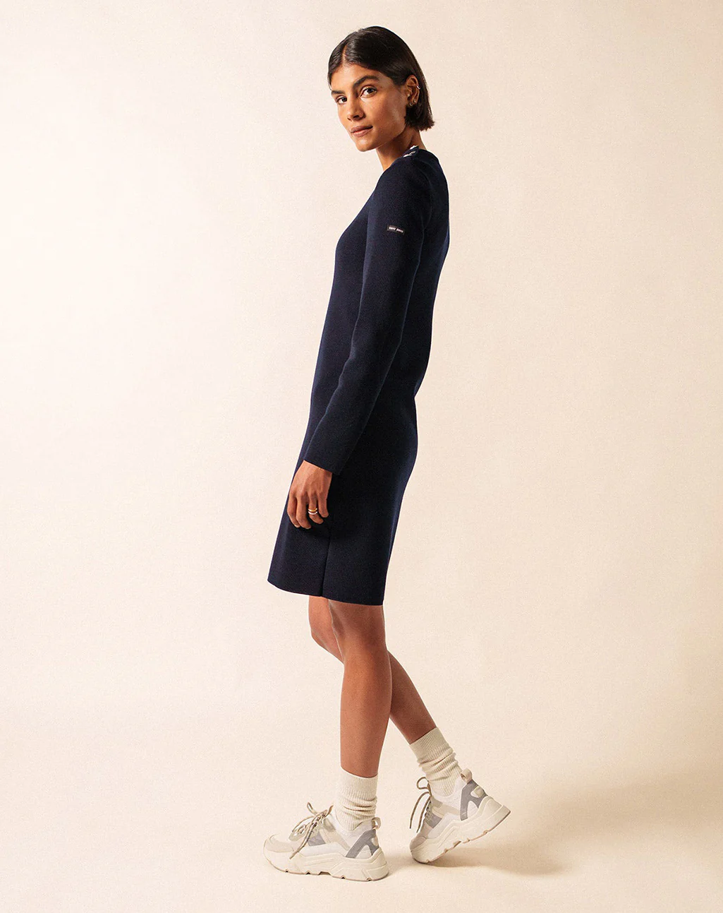 Met een slanke, aansluitende pasvorm en een ronde hals straalt deze jurk eenvoud en klasse uit. De zilveren knoopsluiting op de linkerschouder, kenmerkend voor de Saint James marine-stijl, voegt een subtiele, maritieme touch toe. De lange mouwen en het 1×1 ribbreisel zorgen voor een flatterende en comfortabele pasvorm.