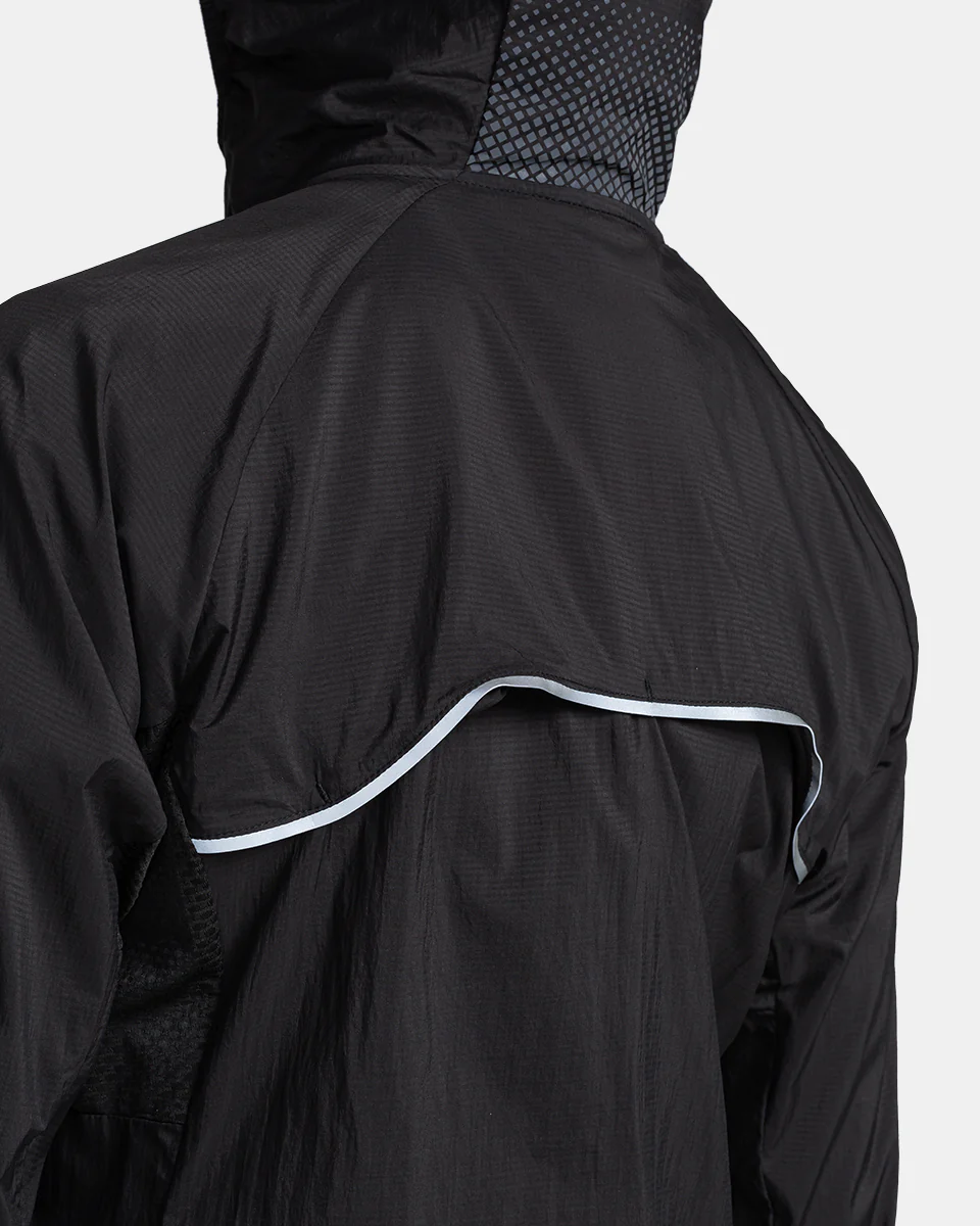 Opvallende reflecterende elementen op de mouwen en capuchon zijn goed zichtbaar in het donker.