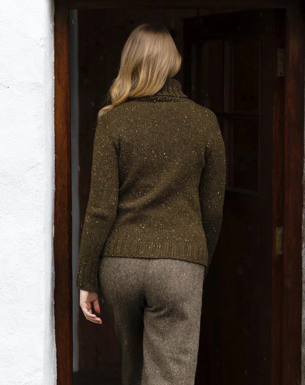 De kenmerkende Donegal-tweedstructuur met subtiele kleurspetters in geel, oranje, groen en koningsblauw geeft de trui een levendige en eigentijdse look, terwijl de slanke pasvorm zorgt voor een elegant silhouet. De hoge col biedt warmte zonder te knellen, en de saddle shoulder-afwerking voegt een ambachtelijk detail toe dat de kwaliteit onderstreept.