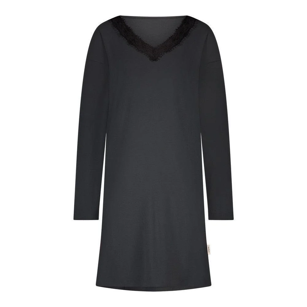 De lange mouwen bieden extra comfort op koelere momenten, terwijl de V-hals met kantdetail een elegante touch toevoegt.