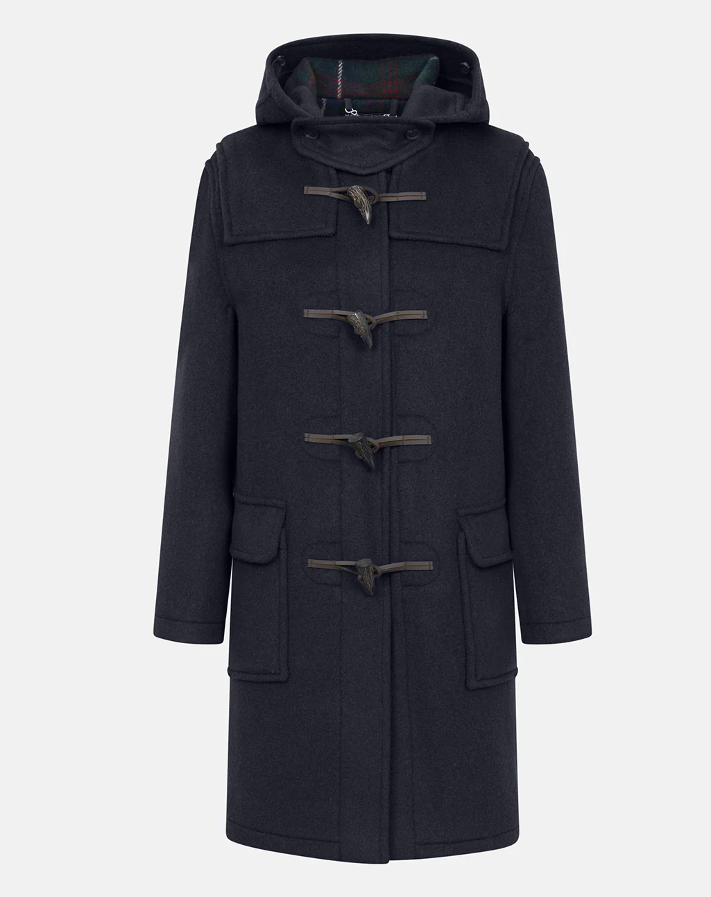 Vervaardigd van een dubbelzijdige wolmix met een geruite voering, combineert deze jas warmte en comfort met een uitgesproken stijl. De authentieke houtje-touwtjesluiting bestaat uit buffelhoornknopen en leren lussen, terwijl de capuchon en ruime klepzakken zorgen voor extra bescherming en functionaliteit.