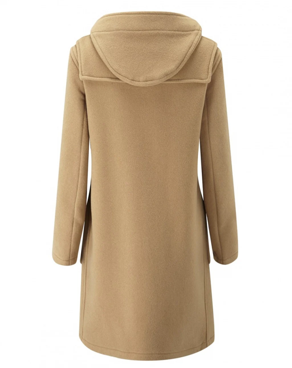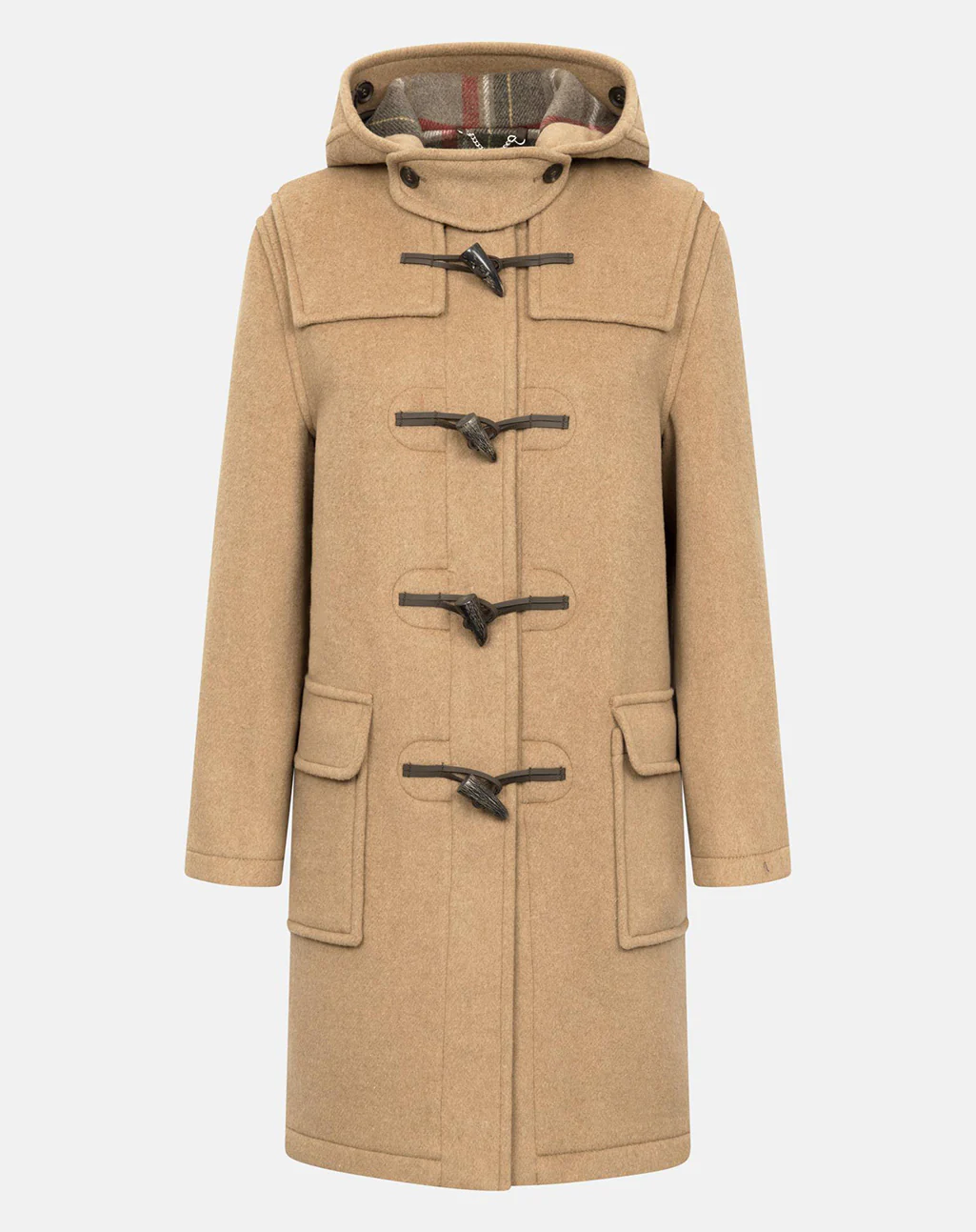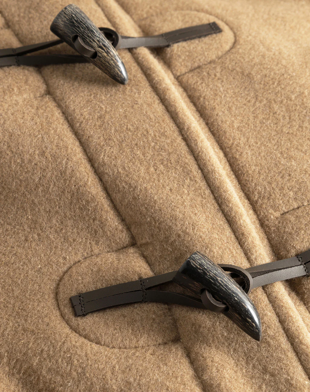 Vervaardigd van een dubbelzijdige wolmix met een geruite voering, combineert deze jas warmte en comfort met een uitgesproken stijl. De authentieke houtje-touwtjesluiting bestaat uit buffelhoornknopen en leren lussen, terwijl de capuchon en ruime klepzakken zorgen voor extra bescherming en functionaliteit.