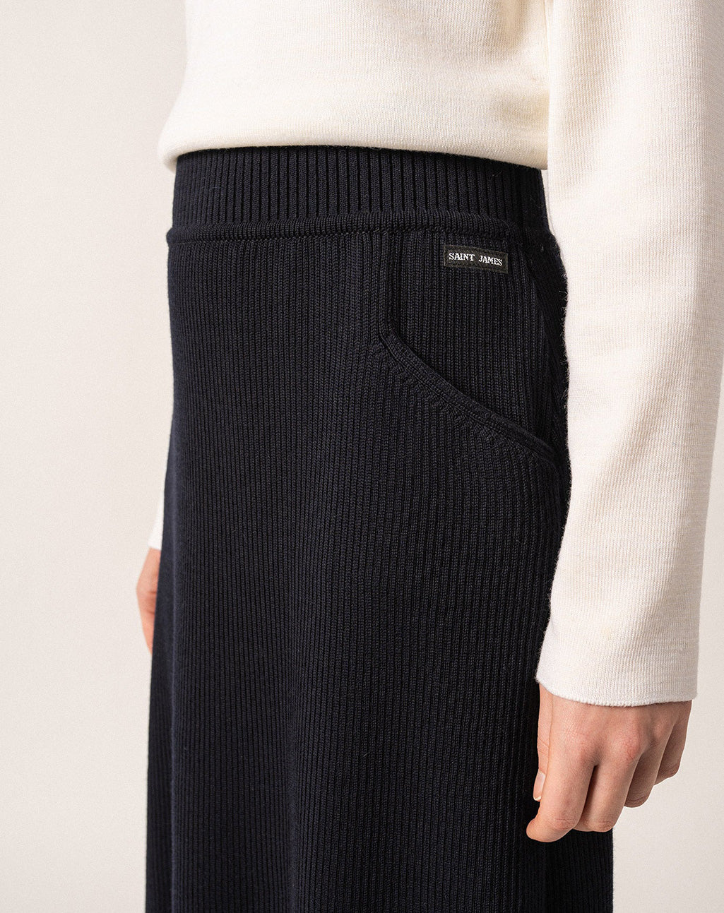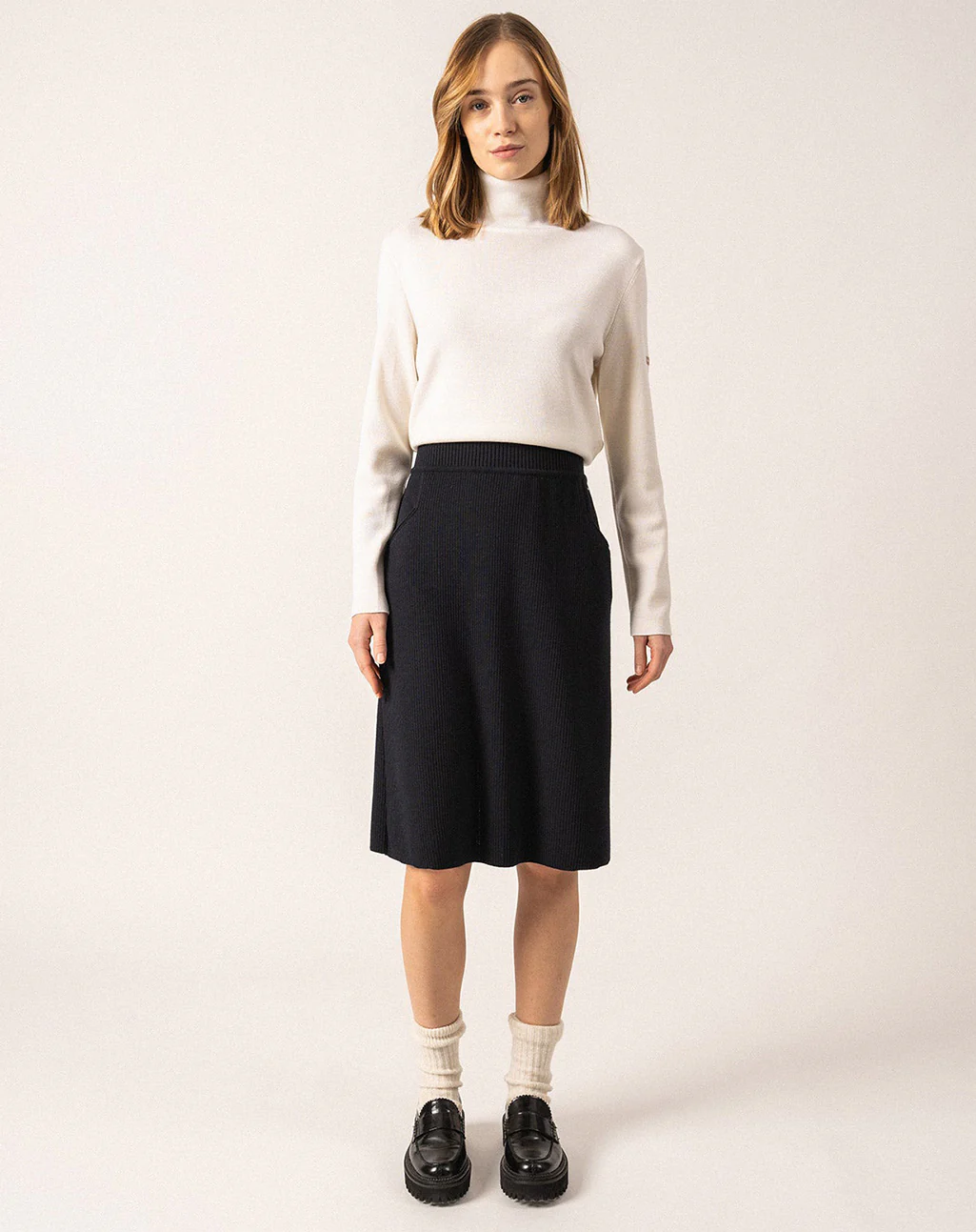 De Artigues rok is een stijlvolle en tijdloze keuze voor de koudere maanden. Gebreid in het Saint James atelier in Normandië, biedt deze rok het perfecte evenwicht tussen comfort en elegantie. De rechte snit, gemaakt van zachte en warme merinowol, zorgt voor een flatterend silhouet en een aangename pasvorm.