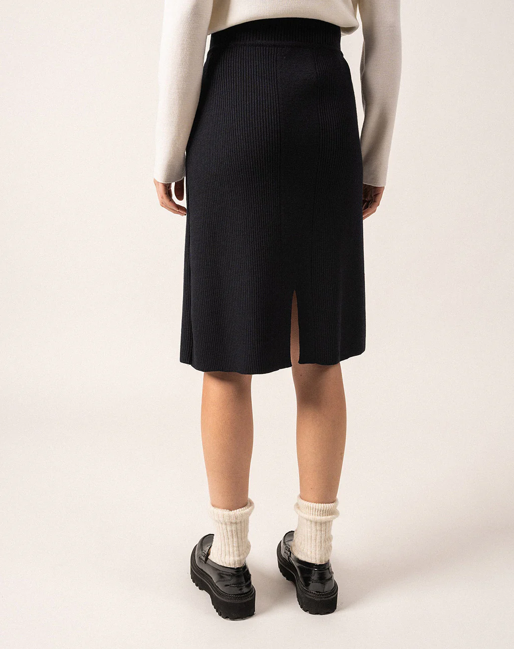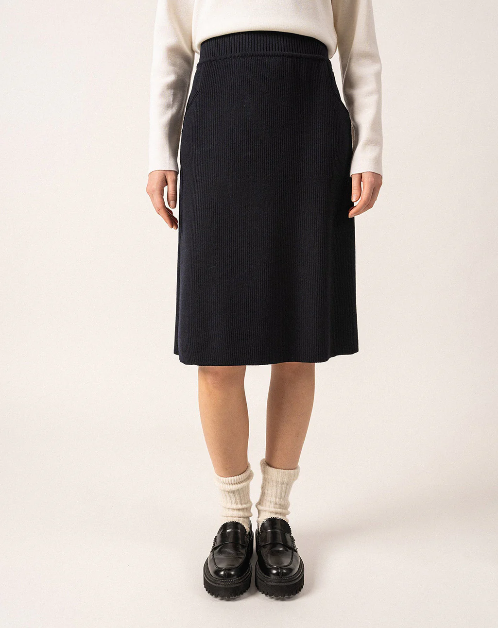 Draag de Artigues rok met een klassieke marineblauwe trui voor een chique, ton-sur-ton look, of combineer met een witte blouse en een cardigan voor een meer formele outfit.