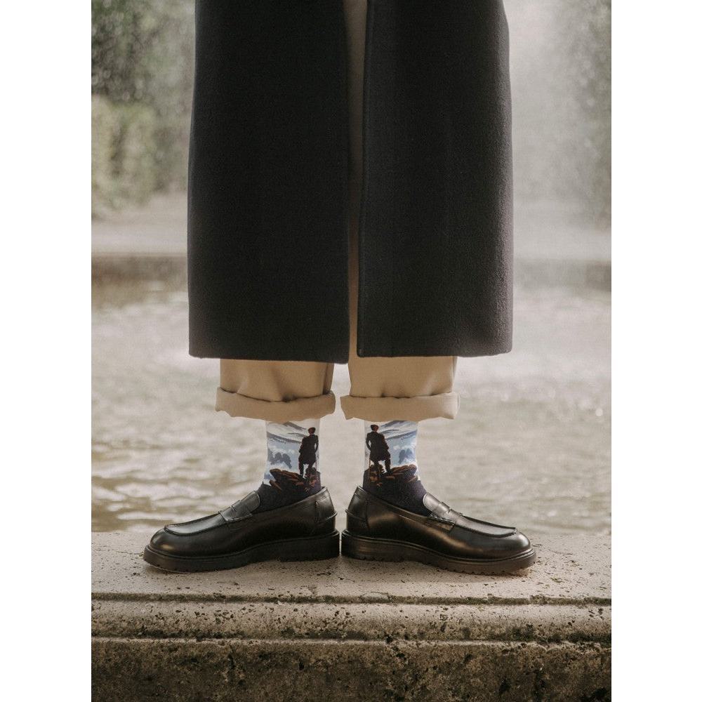 De verpakking is geïnspireerd op Caspar David Friedrichs beroemde werk en vormt een elegante omlijsting voor drie unieke sokdesigns.