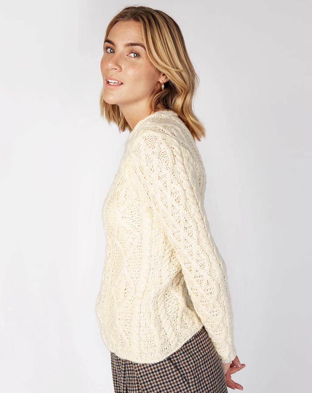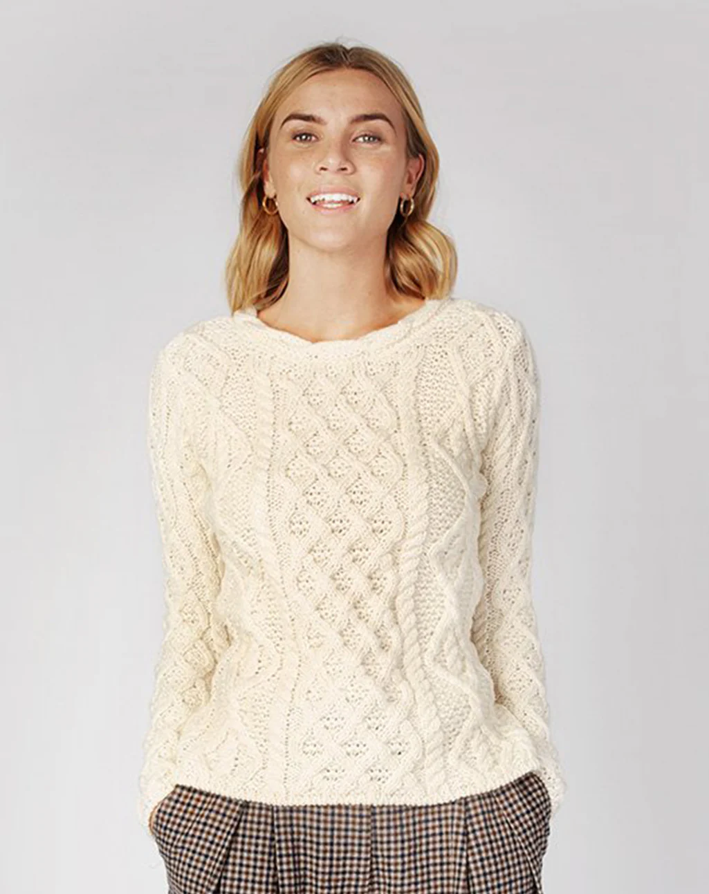 - Authentieke Aran-patronen met kabelhalsafwerking