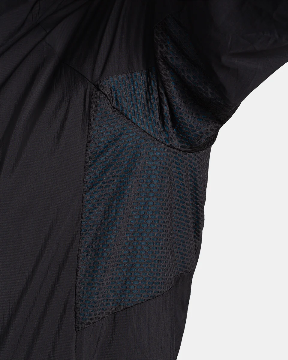Ventilatieopeningen op de rug voor verbeterde microventilatie, samen met ademende mesh-inzetstukken onder de armen.