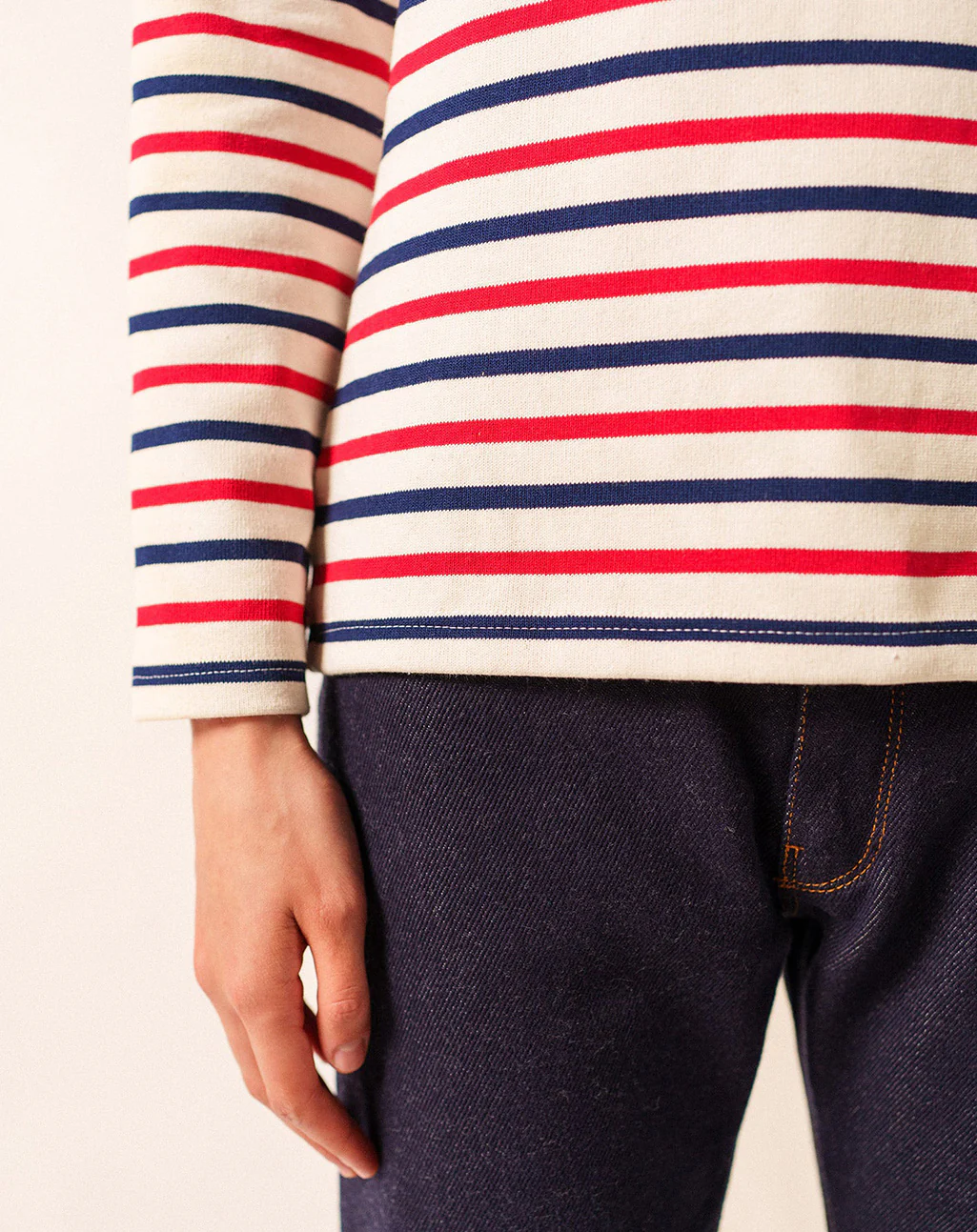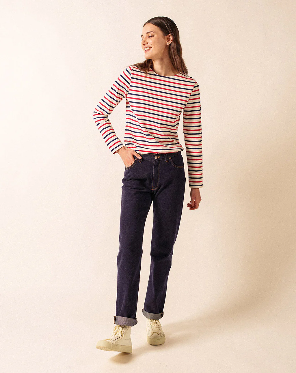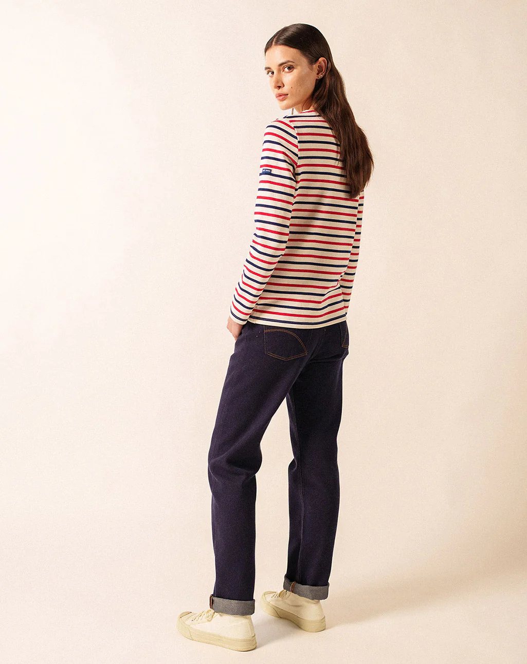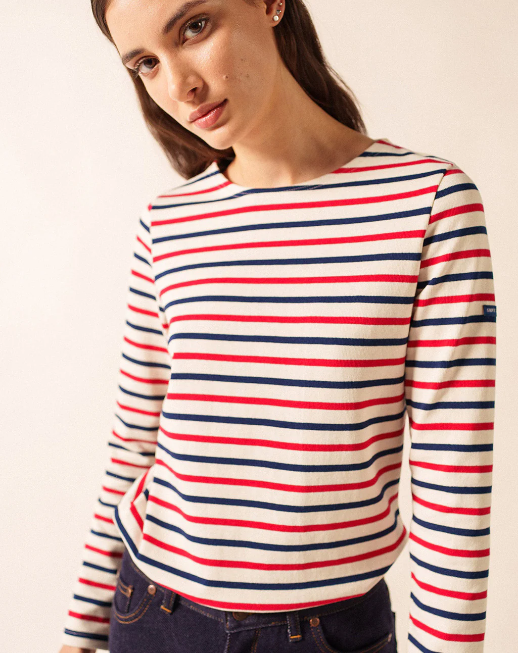 De Meridame II Tri is gemaakt van authentiek gekaard katoen. Dit model biedt een eigentijdse interpretatie van de originele marinestreep, speciaal aangepast aan het vrouwelijk lichaam. De rechte snit met subtiel geaccentueerde taille zorgt voor een vrouwelijk silhouet, terwijl de wijde ronde hals het draagcomfort verhoogt.