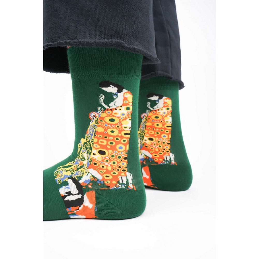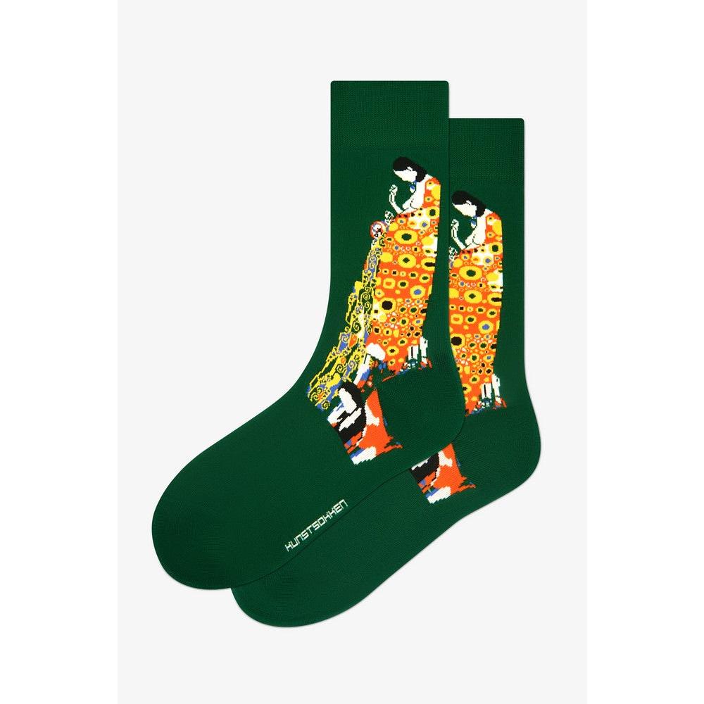 • Inspirerend design: het iconische schilderij Hope II van Gustav Klimt verwerkt in een kunstzinnig sokkenontwerp.