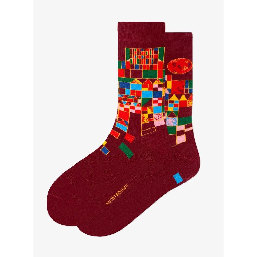 Simpele lijnen die vakjes creëren en die Klee inkleurde met felle roodtinten en andere kleuren.