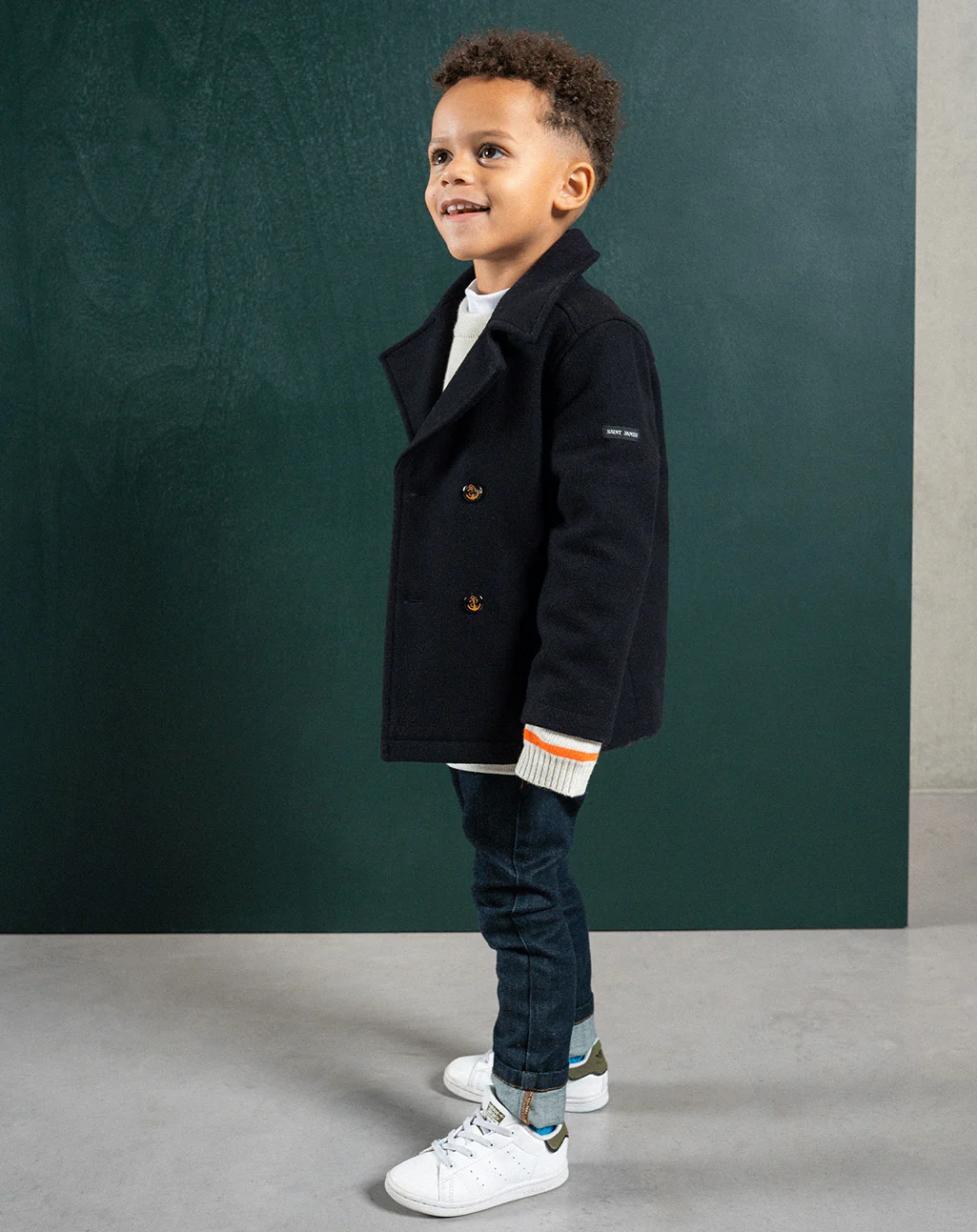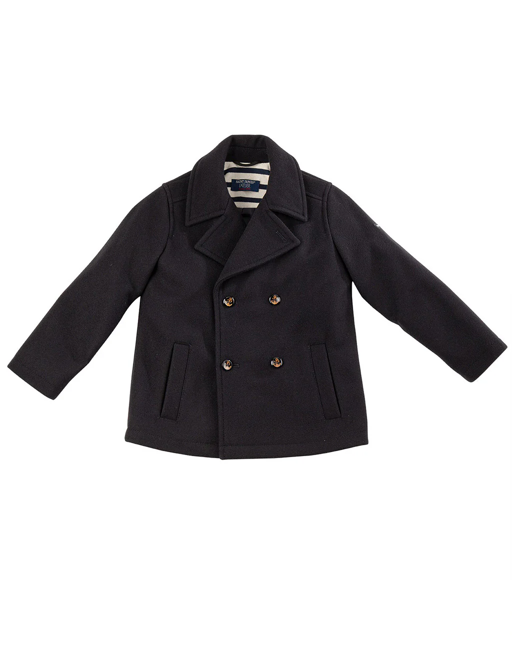 Gemaakt van wollen stof biedt deze jas warmte en comfort voor jonge zeelieden in de dop. De kraag met revers en de dubbele knoopsluiting voegen een elegante touch toe, terwijl de opgestikte zakken aan de voorkant zowel praktisch als stijlvol zijn. De gestreepte binnenvoering, de hoornen knoop met gegraveerd anker en het Saint James logo op de linker mouw maken de maritieme uitstraling van deze jas compleet.