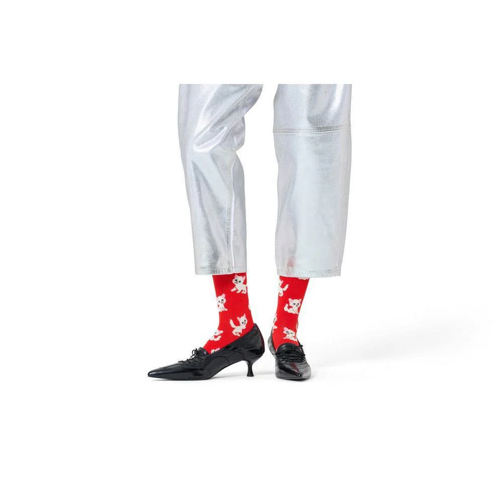 Met een vrolijke print van witte kittens op een vurige rode achtergrond, brengt deze sok instant vrolijkheid in je outfit – of je nu naar kantoor gaat of een casual dag hebt gepland.