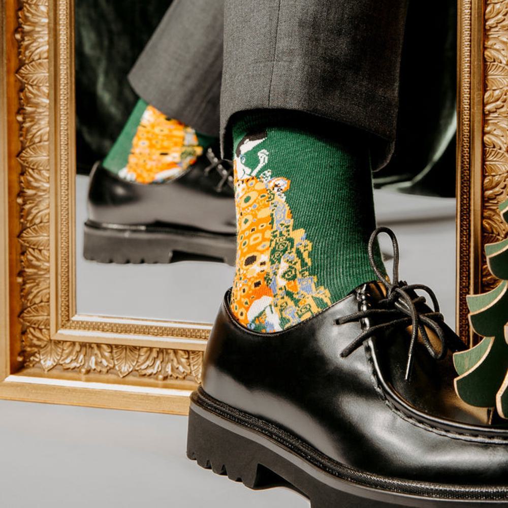 De giftbox bevat drie paar hoogwaardige sokken, elk geïnspireerd op een meesterwerk van Gustav Klimt: De Kus, The Tree of Life en Hope II.