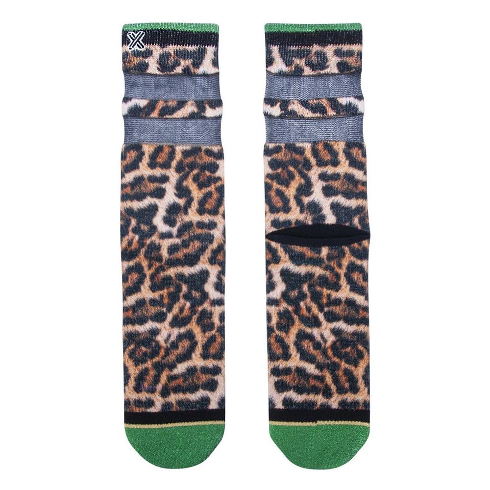 Sokken met luipaard print en groen/blauw/zwarte strepen.