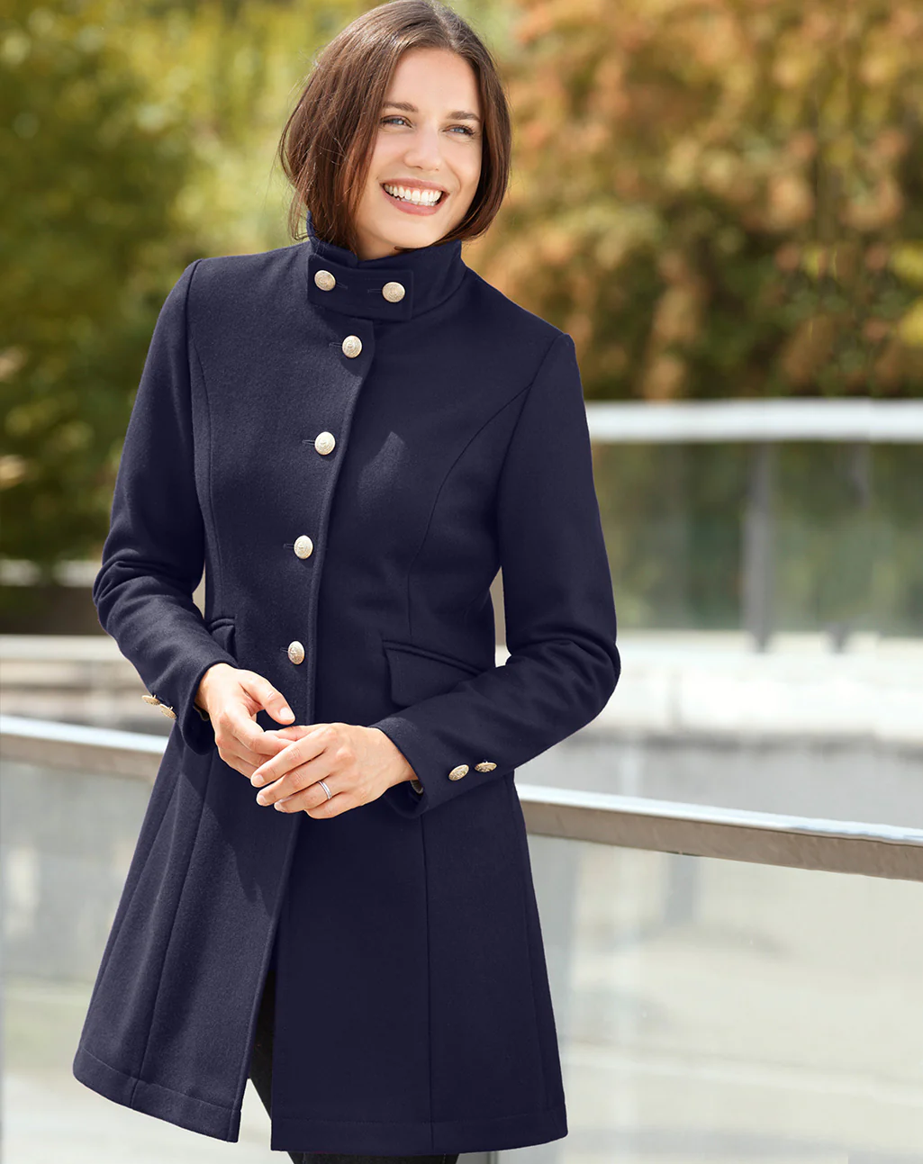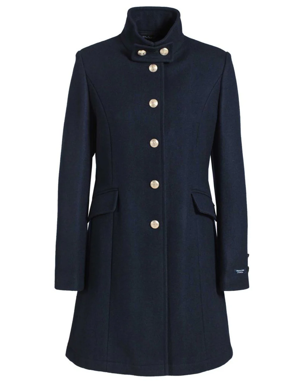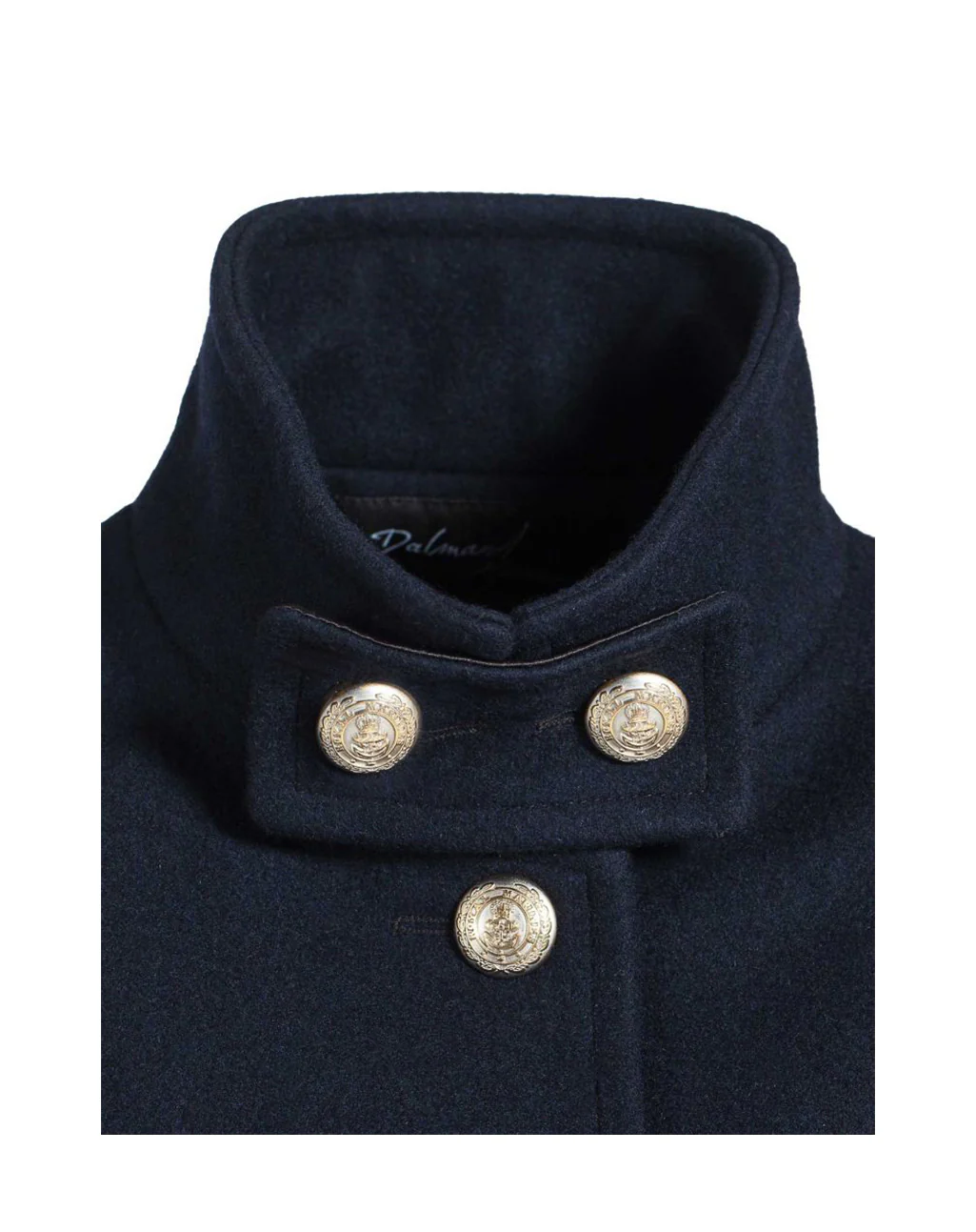 De Brighton van Dalmard Marine is een elegante 3/4 lange officiersjas met een vrouwelijke, licht getailleerde snit en klassieke maritieme details. De jas is gemaakt van warm, waterdicht wollen doek en afgewerkt met een enkele rij opvallende gouden ankerknopen die het silhouet stijlvol benadrukken.