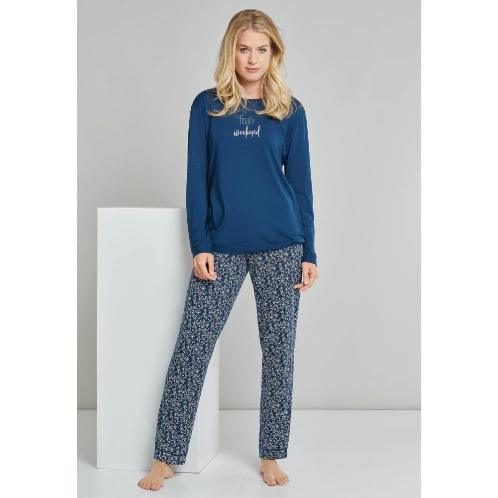 De crèmekleurige, delicate bloemenprint maakt deze petrolkleurige damesbroek tot uw nieuwe bijzondere favoriet!