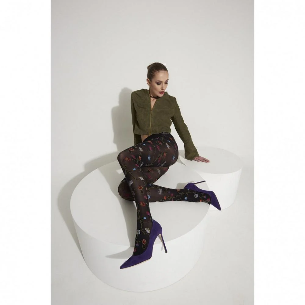Een unieke dikke zwarte panty met bloemenpatroon, van draaiende stengels en decoratieve bloemen..