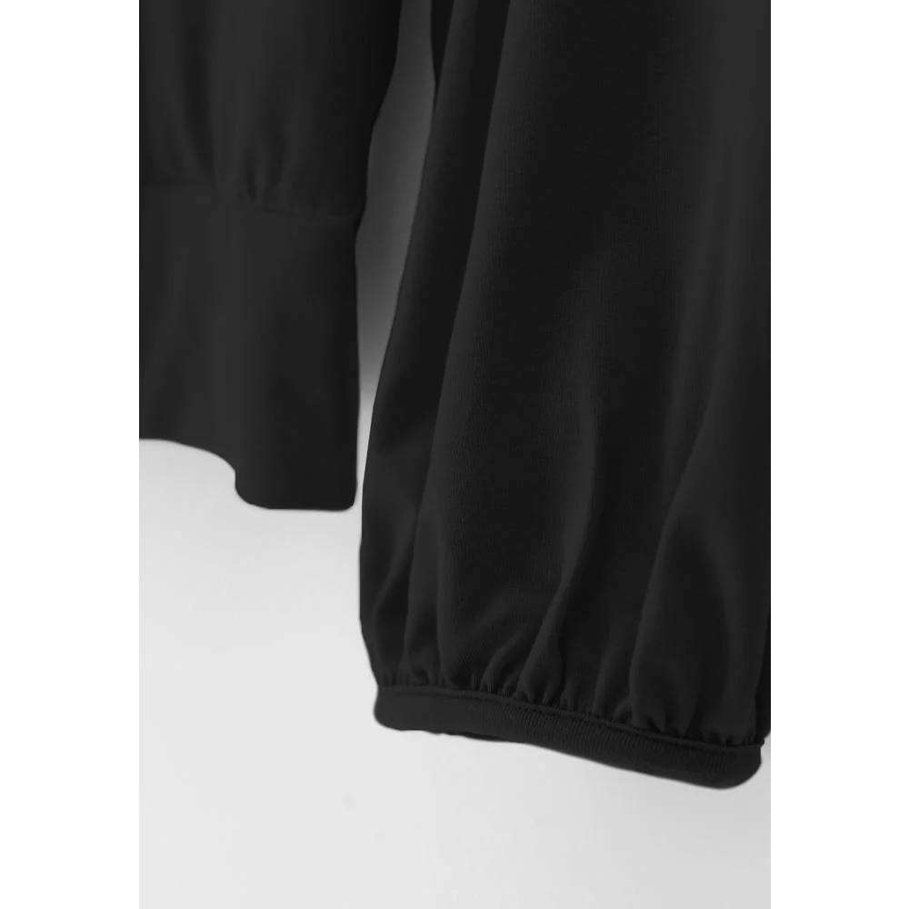 De lange, wijde mouwen met gerimpelde polsen versterken het vloeiende silhouette van de blouse,