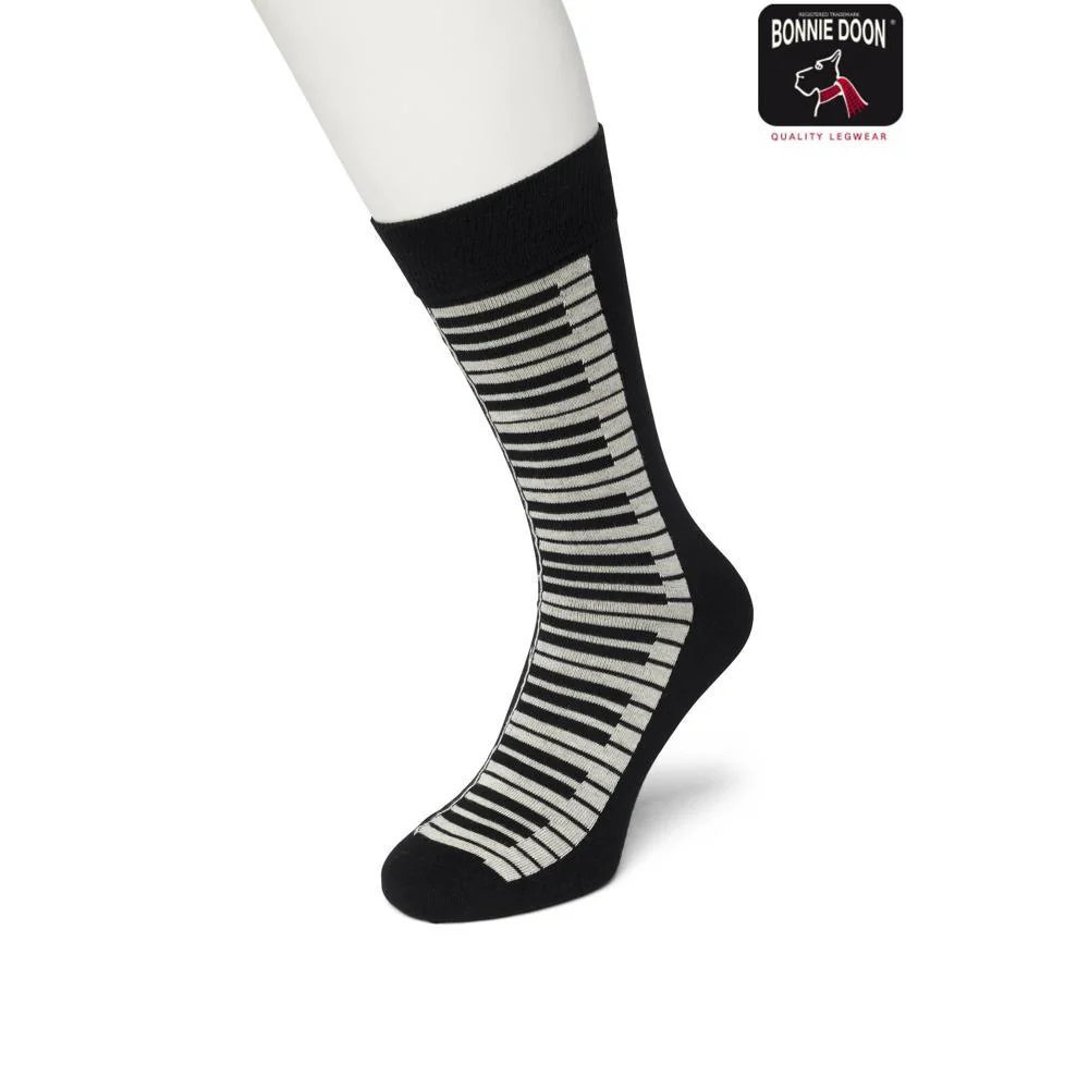 Over de gehele sok loopt een patroon van piano toetsen.