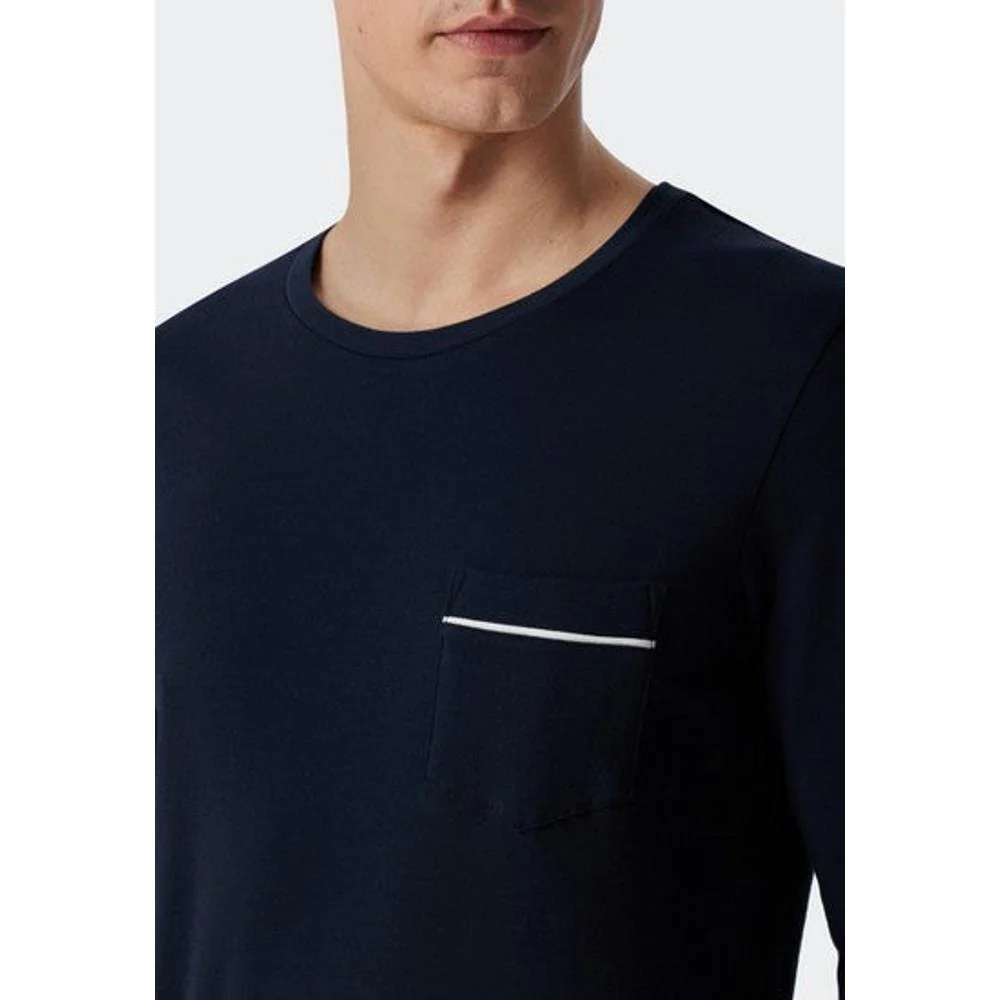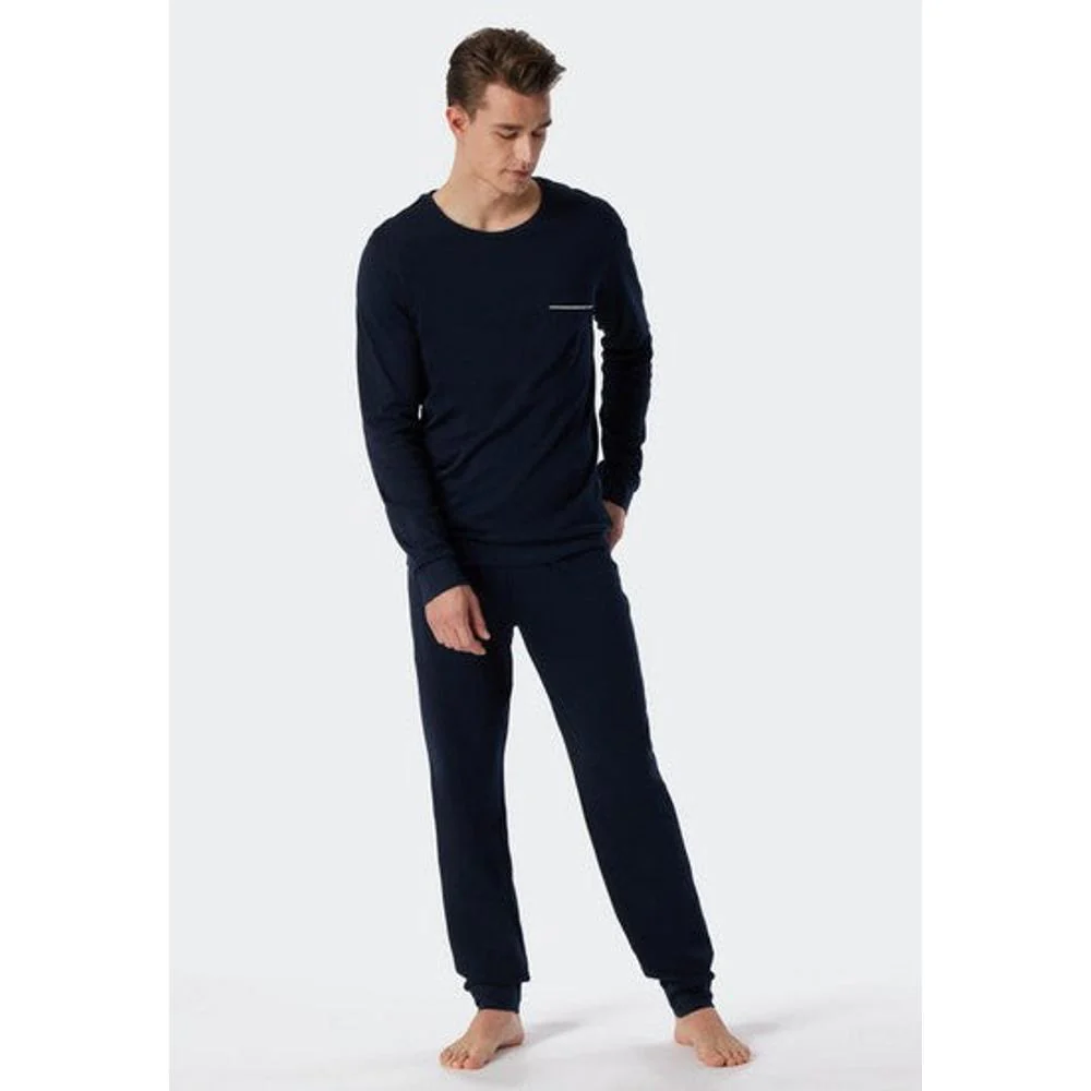 Het bovenstuk met ronde hals en borstzak met subtiele bies straalt tijdloze klasse uit. Dankzij de comfortabele boordjes aan mouwen en zoom blijft de pasvorm mooi in model. De lange broek met boorduiteinden sluit prettig aan en biedt optimale bewegingsvrijheid – ideaal voor een ontspannen nachtrust.