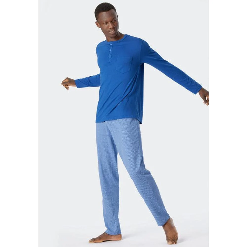 Deze Schiesser pyjama bestaat uit een shirt met lange mouwen en genoopte hals en