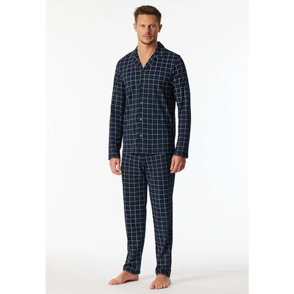 • Lange herenpyjama in nachtblauw met stijlvol ruitjespatroon