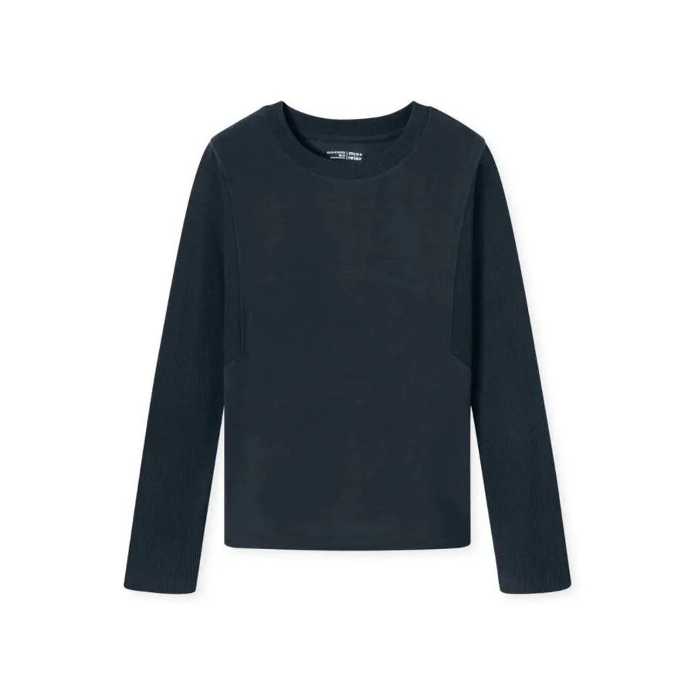 Dankzij de combinatie van gladde stof aan de voorzijde en geribbelde inzetstukken aan de mouwen en zijkanten, biedt deze top een subtiele, stijlvolle structuur.