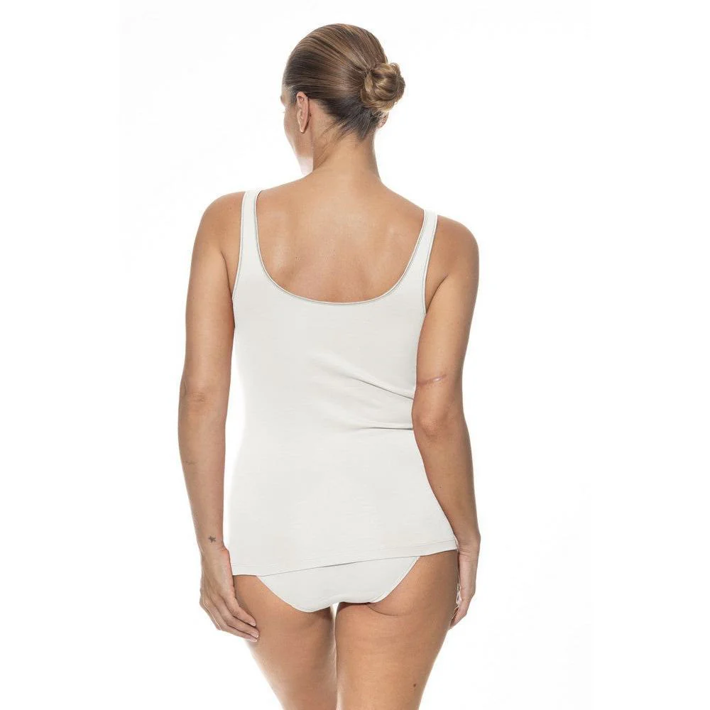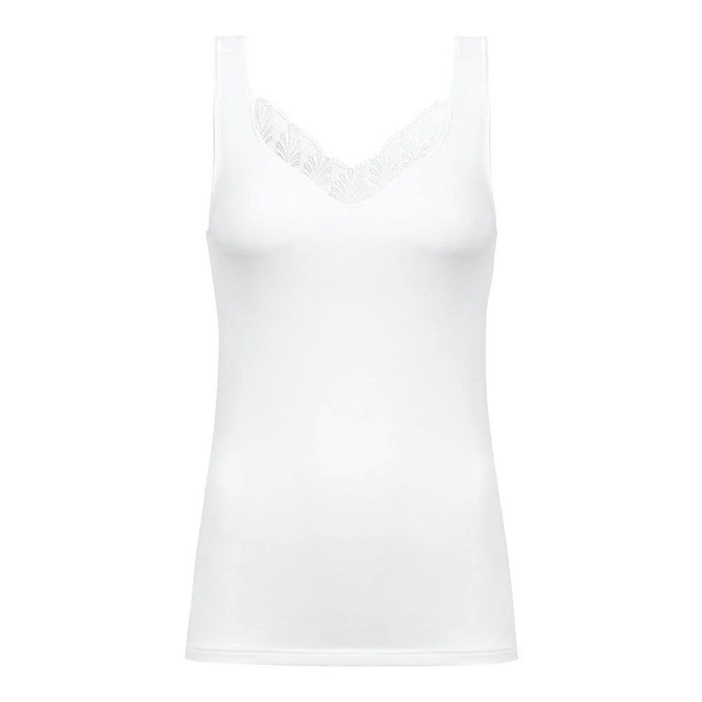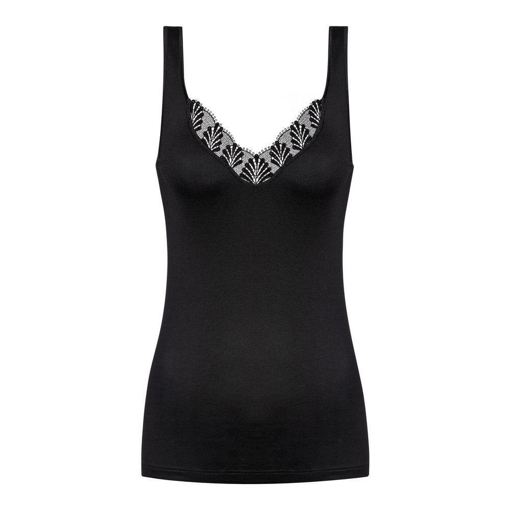 Het zachte, geborduurde kant langs het decolleté en de schouderbandjes geeft de top een vrouwelijke en luxueuze uitstraling, terwijl het soepele materiaal prettig meebeweegt met het lichaam.