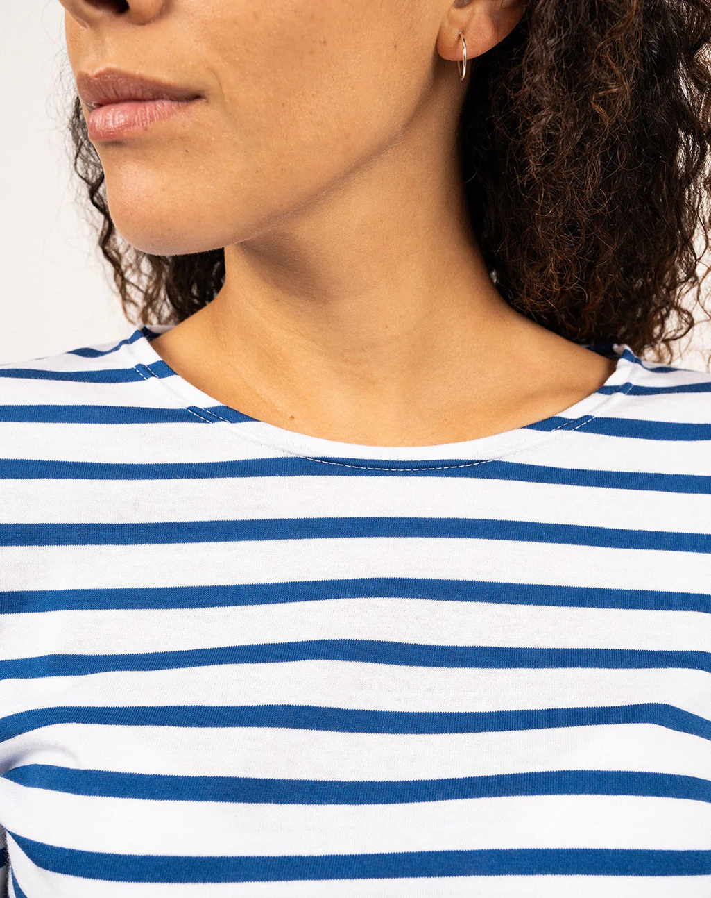 De Minquidame is de nieuwste aanwinst in de tijdloze collectie Bretonse streepshirts voor dames. Dit shirt is de vrouwelijke variant van de Minquiers Moderne, heeft een eigentijdse pasvorm, lange mouwen en een ronde hals. Het shirt is gemaakt van dun katoen, perfect voor alle seizoenen.