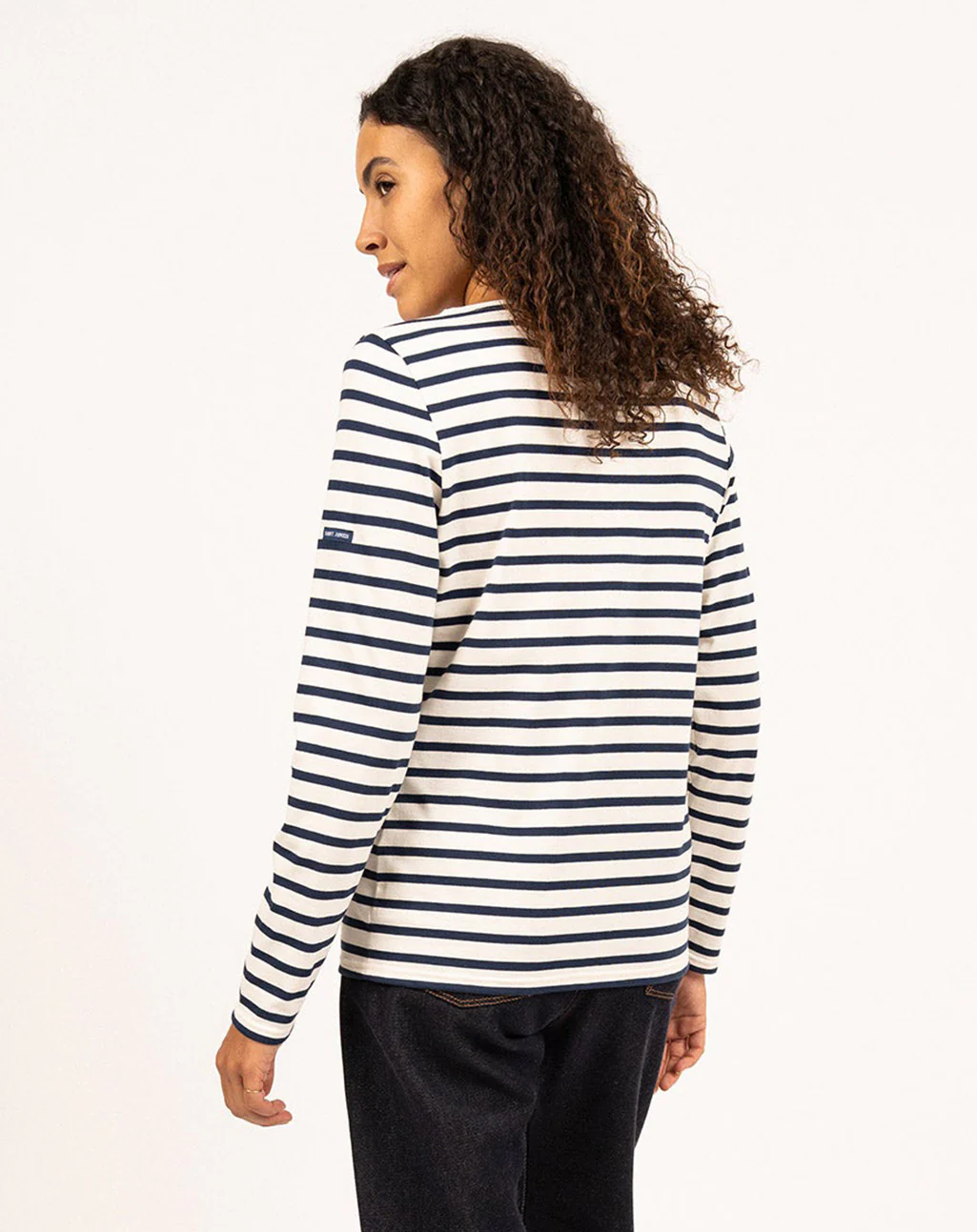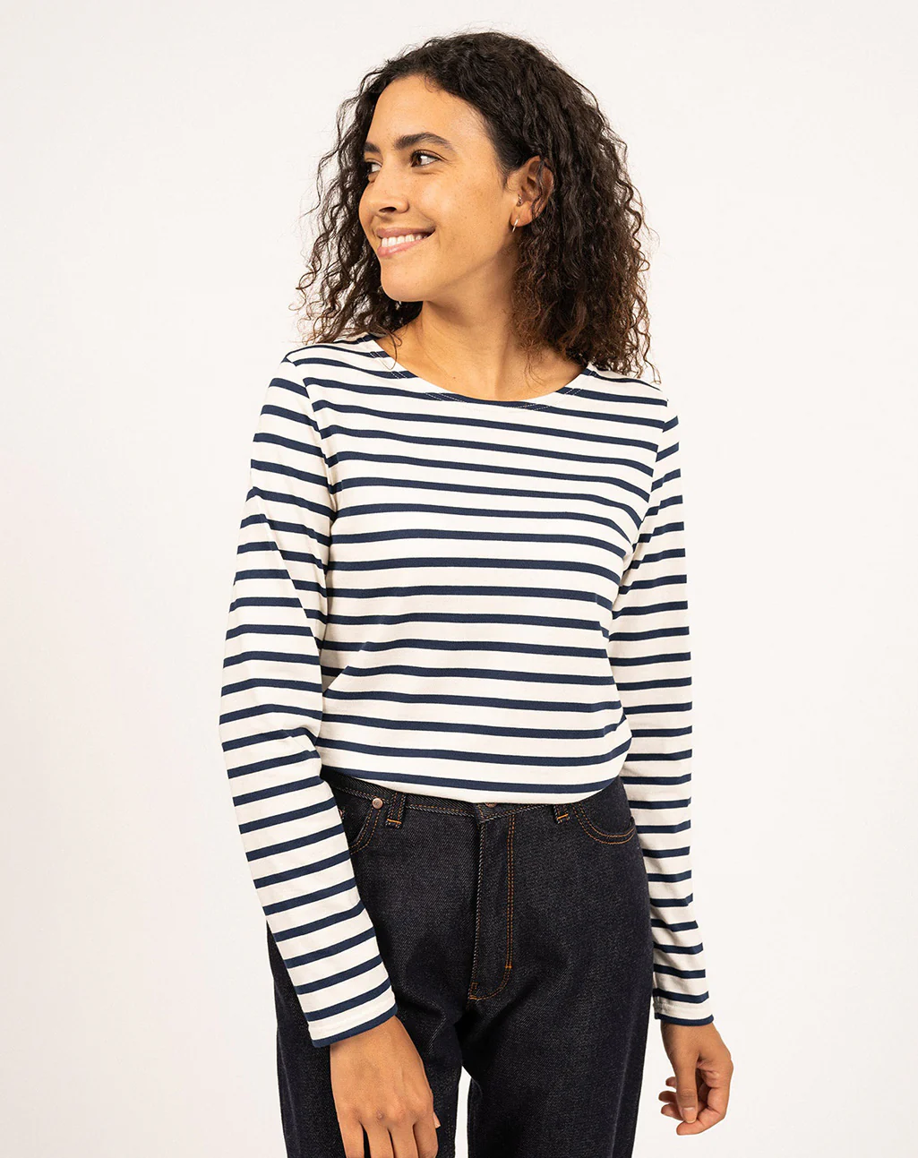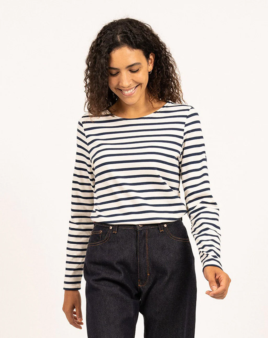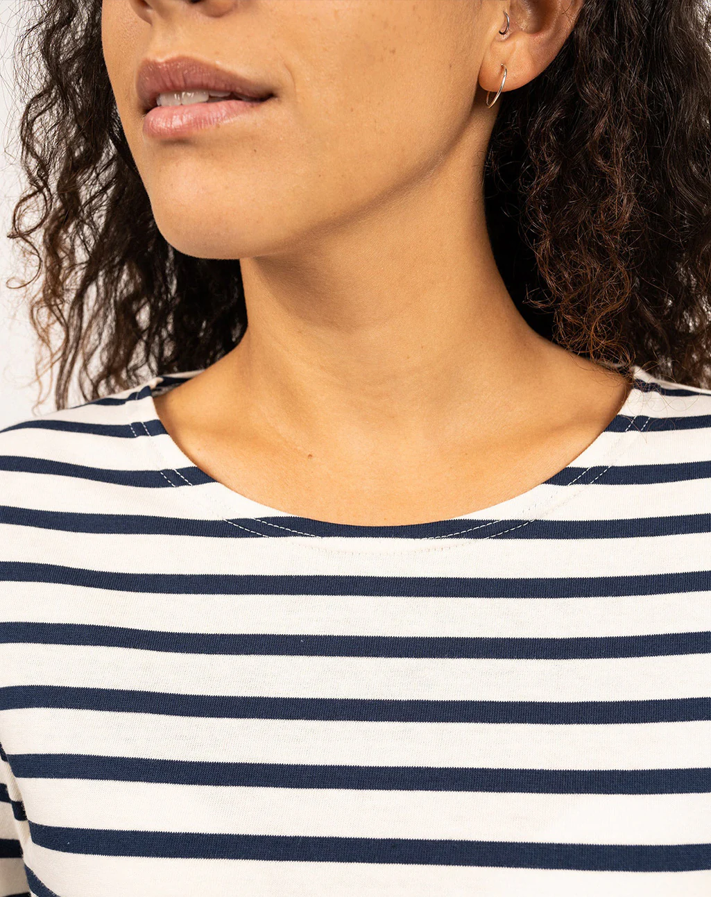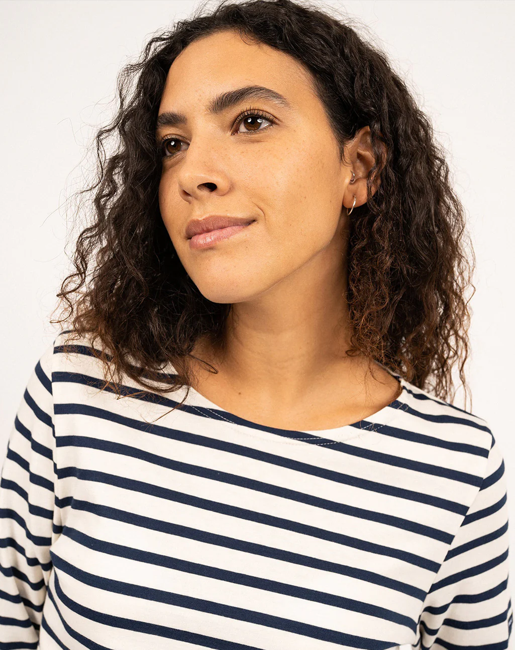 De Minquidame is de nieuwste aanwinst in de tijdloze collectie Bretonse streepshirts voor dames. Dit shirt is de vrouwelijke variant van de Minquiers Moderne, heeft een eigentijdse pasvorm, lange mouwen en een ronde hals. Het shirt is gemaakt van dun katoen, perfect voor alle seizoenen.