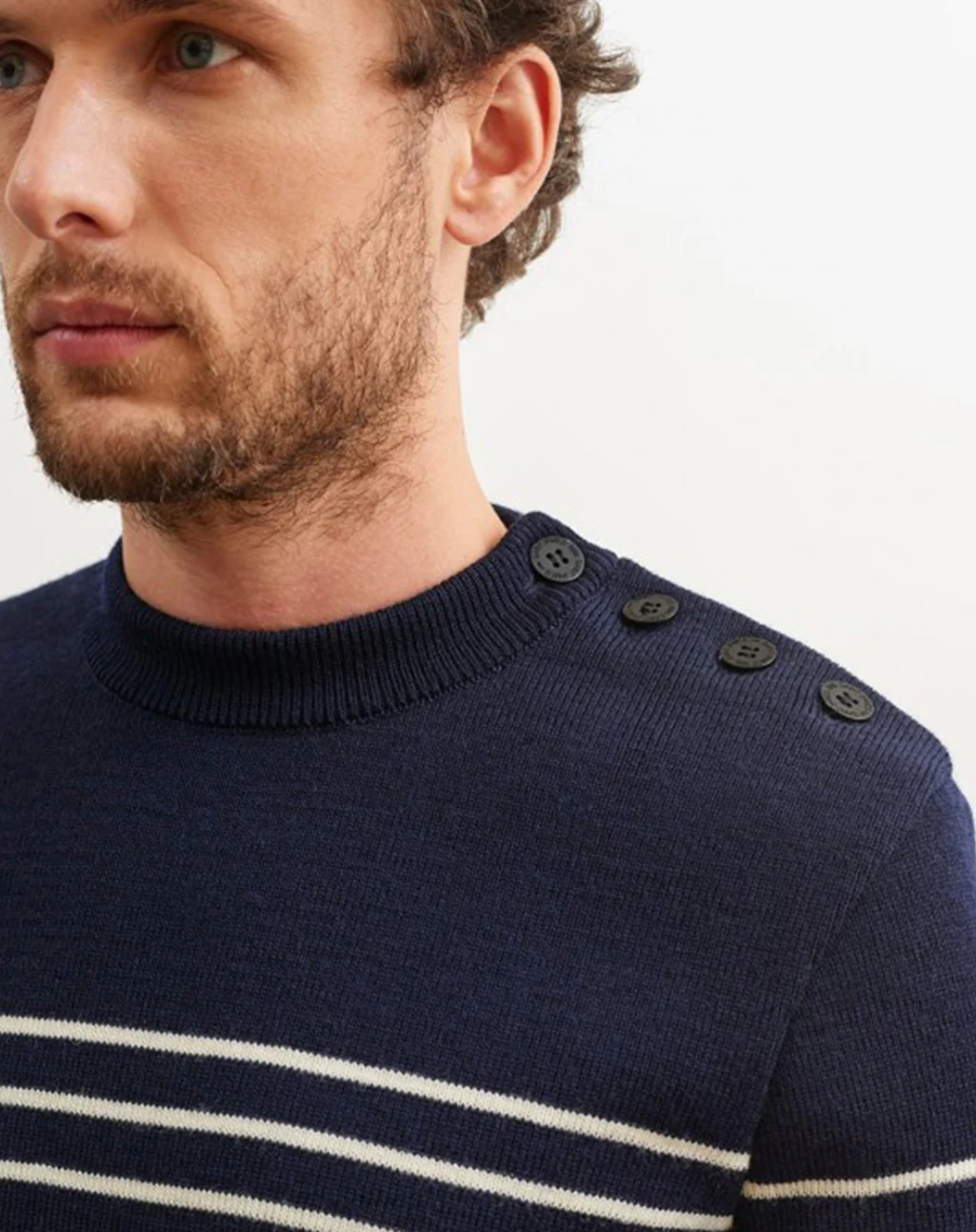 De Binic is een authentieke Bretonse visserstrui, rechtstreeks geïnspireerd op de klassieke truien die al generaties lang door zeelieden worden gedragen. Met zijn iconische maritieme strepen en karakteristieke schouderknoopsluiting aan de linkerzijde, is deze trui een tijdloze toevoeging aan elke garderobe.