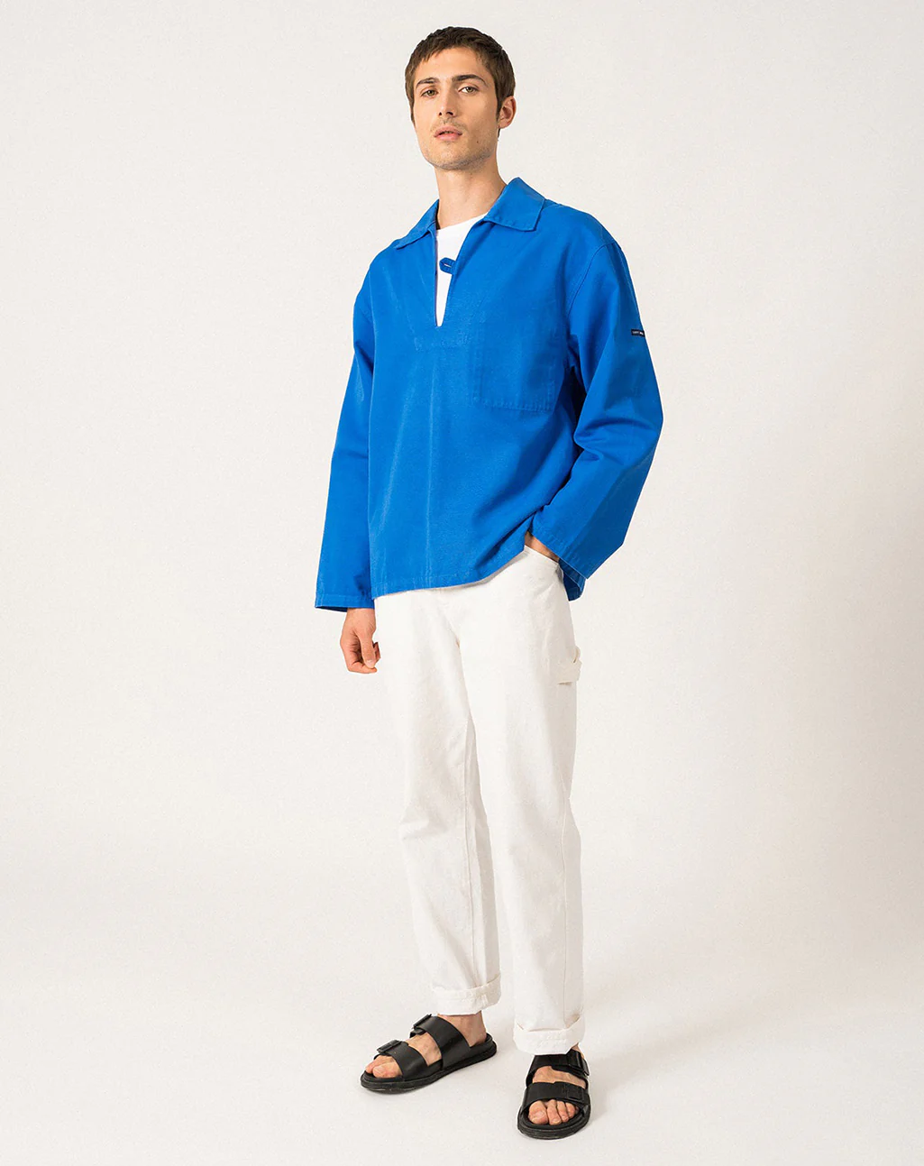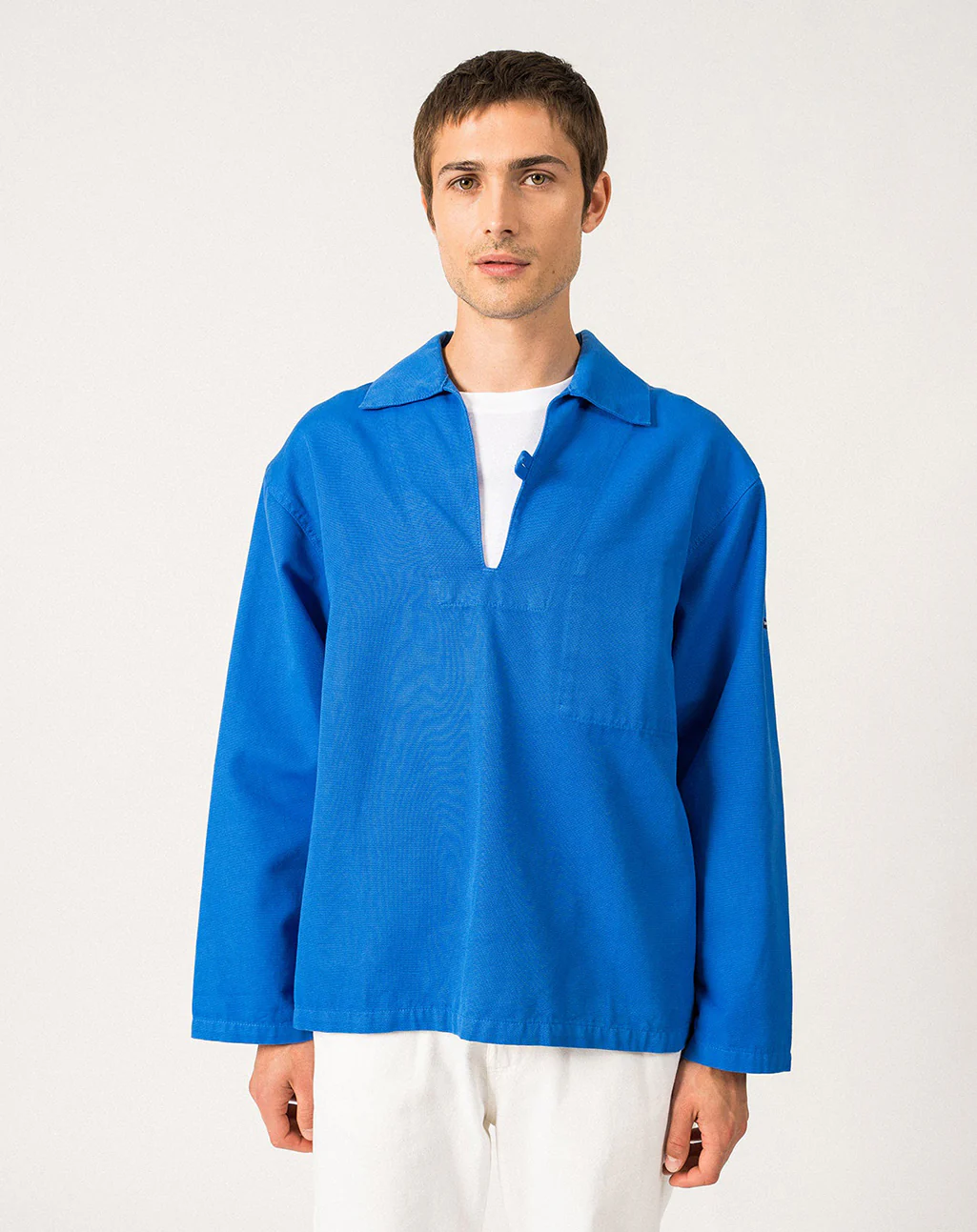 De Nemo is een traditionele Bretonse visserskiel, ooit gemaakt van restjes zeildoek en nu vervaardigd uit dik en stevig katoen dat bestand is tegen weer, wind en zwaar werk. Deze authentieke kiel heeft een rechte pasvorm, een splitkraag met knoopsluiting en een verborgen binnenzak met knoopje – praktisch ontworpen om niet te blijven haken in de netten.