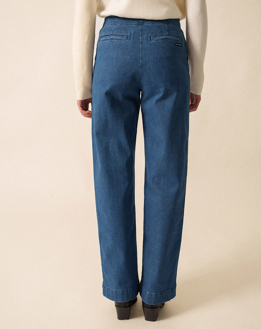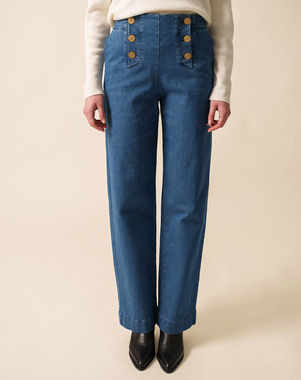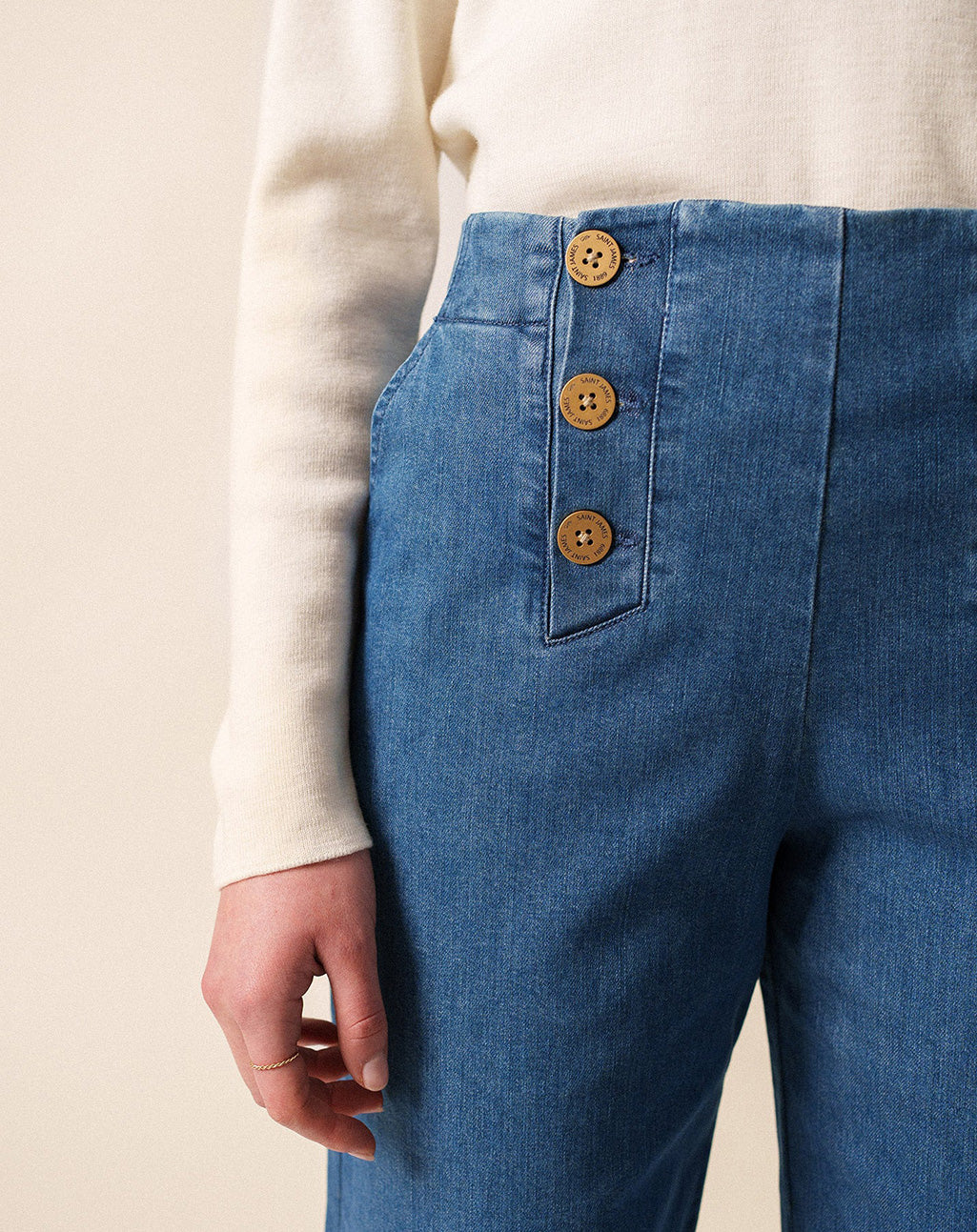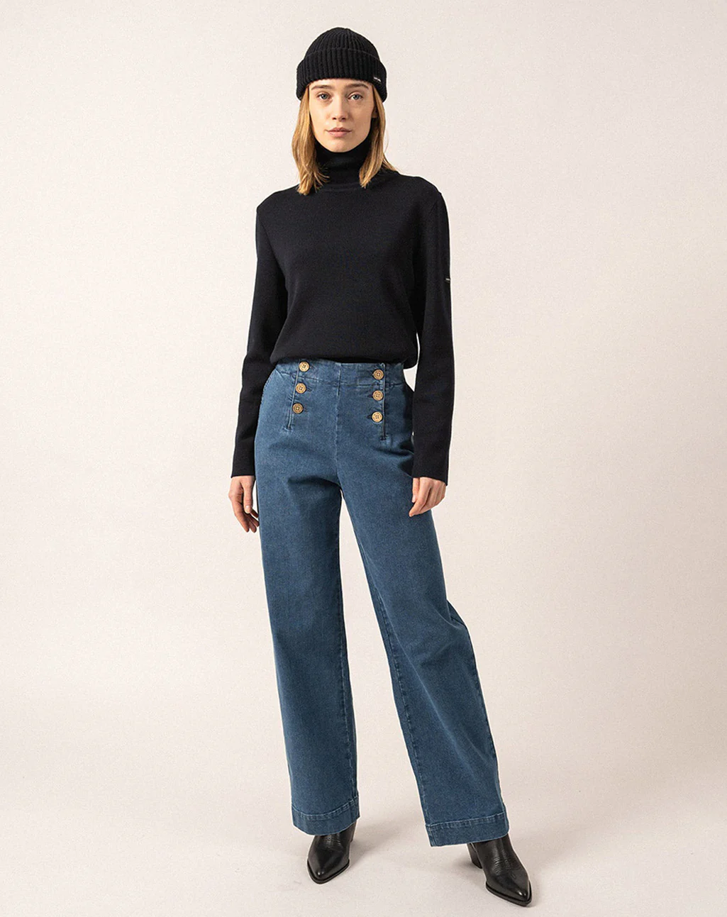 Met zijn rechte, brede pasvorm en hoge taille is de Torie een eigentijdse jeans die perfect past binnen de moderne garderobe. De voorzijde is voorzien van een dubbele knopenrij met goudkleurige, gegraveerde knopen, een subtiele verwijzing naar het nautische erfgoed van Saint James.