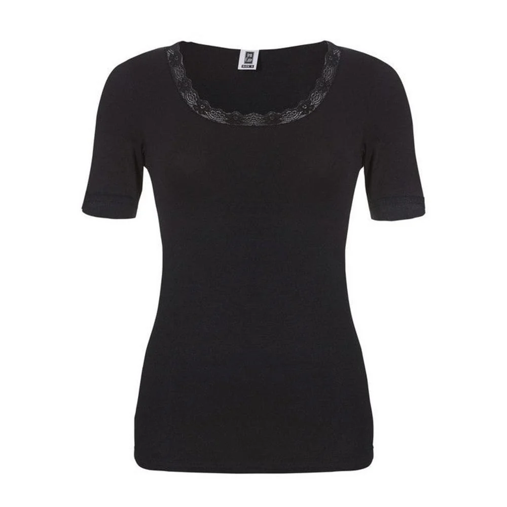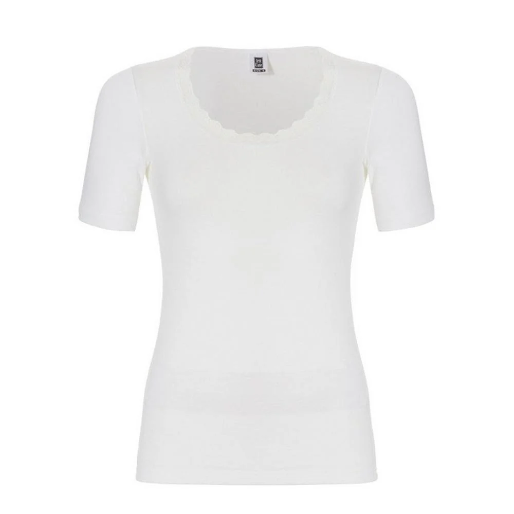 Dit shirt met brede ronde hals, afgewerkt met kanten rand en korte mouwen, is speciaal ontworpen om je lichaam optimaal te isoleren, zonder in te boeten op draagcomfort.